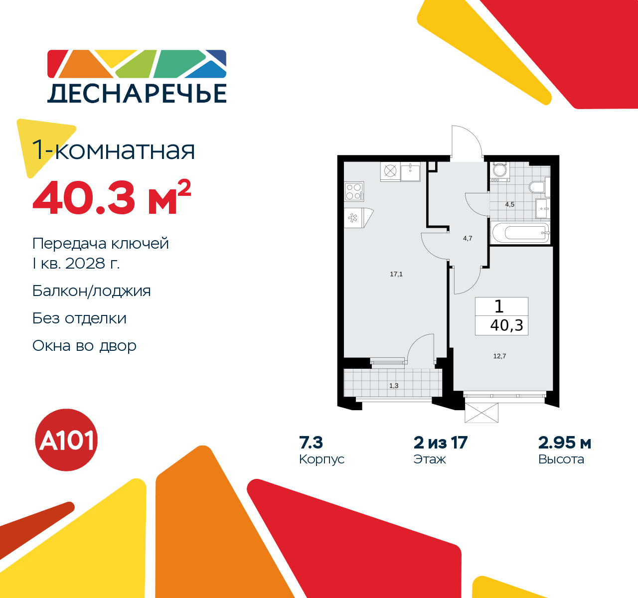 Однокомнатная квартира в ЖК "Деснаречье" на 2 этаже. Квартира без отделки, новый владелец может сделать ремонт по своему проекту. Общая площадь: 40.3 кв.м., жилая: 12.7 кв.м., площадь просторной кухни-столовой: 17.1 кв.м. Все окна выходят на одну сторону. В квартире одна лоджия, один совмещенный санузел. Высота потолков 2.95 м. Эта квартира предлагается без отделки. Будут установлены стеклопакеты с повышенной тепло- и шумоизоляцией, в квартиру заведены все коммуникации. Вы сможете в полном объеме реализовать ваши идеи обустройства вашего комфортного дома. Для тех, кто ценит время и не хочет дополнительных трат на ремонт мы предлагаем квартиры с предчистовой и дизайнерской отделкой. Дом монолитный, черырехподъездный, переменной этажности, от 9 до 17 этажей. Квартира находится во 2-й секции высотой 9 этажей в корпусе 7.3. На этаже 5 квартир. В подъезде 1 пассажирский и 1 грузовой лифт. Начало строительства - 2 квартал 2025 года. Окончание строительства - 1 квартал 2028 года. Оформление сделки по договору долевого участия. Артикул квартиры по базе застройщика 88К-7.3-662. ПРЕДЛОЖЕНИЯ ОТ ЗАСТРОЙЩИКА В ОКТЯБРЕ 2025: Ипотека от 13,9 % для всех! На весь срок. "Семейная ипотека" вернулась. Ставка от 3,5 % на весь срок! Без удорожания! Выгодное ипотечное комбо: Ипотека от 2200 р./мес. и от 6 % после рождения ребёнка! Ипотека для всех "Держи пять!" - ставка 5 % на 2 года! *более подробную информацию по скидкам и акциям уточняйте в отделе продаж Масштабный проект "Деснаречье" на юго-западе Москвы, который включает три новых района («квартала»), объединённые общей идеей – воплотить в реальность мечты современных жителей столицы об интересном, комфортном и разноплановом городском пространстве в окружении рек и лесов, словно сошедших с полотен русских живописцев: - «Берег» оценят все, кому близка водная стихия: плеск волн, солнечные блики и прогулки вдоль тихого течения речи. - «Лес» утопает в зелени парков и лесов. Здесь соблюдён идеальный баланс загородного спокойствия и столичного комфорта. - «Парк», самый энергичный и яркий, отличается высокой концентрацией пространств для спорта и творчества. Жилой комплекс "Деснаречье" расположится в 12 км от МКАД по современному Калужскому шоссе. Внешний облик зданий соответствует современному стилю и стандартам, характерным и для других популярных проектов ГК «А101»: сочетание контрастных тонов, большое количество остекления, в котором отражается небо, гармония с природным окружением. Весь город - в вашем районе. Находиться на территории «15-минутного города» значит иметь всё необходимое для полноценной жизни в шаговой доступности. Маршруты в районе «Деснаречье» выстроены так, чтобы добраться до магазинов, парков, школ, салонов услуг и других объектов можно было всего за несколько минут пешком или на велосипеде. Двор закрытый от машин – это тишина, комфорт и безопасность, поэтому все машино-места (включая «семейные» и увеличенные, с возможностью установки роллетных шкафов) находятся в подземном паркинге. В паркинги можно спуститься на лифте из любого подъезда или по лестнице. Рядом с «Деснаречьем» в 2027 году планируется открытие станции метро «Десна», до которой будет удобно добраться пешком или на велосипеде. Дорога на автомобиле до перехватывающих парковок станций «Ольховая» и «Прокшино» займёт около 10 минут. В процессе реализации проекта буду