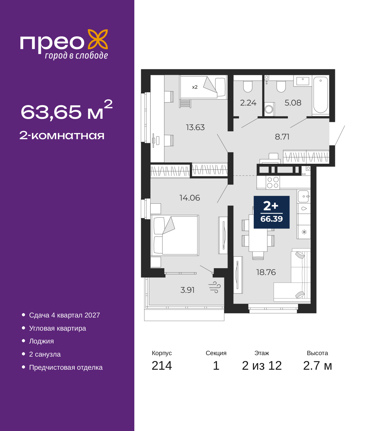 Продается 2-комн. квартира с предчистовой отделкой в ЖК "Прео" на 2 этаже. Общая площадь: 63.65 кв.м., жилая: 27.69 кв.м., площадь просторной кухни-столовой: 18.76 кв.м. Квартира угловая, очень светлая, естественная вентиляция при открытии окон. В квартире одна лоджия, один совмещенный и один раздельный санузел. Высота потолков 2.7 м. Дом монолитный, двухподъездный, переменной этажности, от 12 до 20 этажей. Квартира находится в 1-й секции высотой 12 этажей в корпусе 214. На этаже 8 квартир. В подъезде 1 пассажирский и 1 грузовой лифт. Окончание строительства - 4 квартал 2027 года. Оформление сделки по договору долевого участия. Преображенский — один из самых привлекательных районов для жизни! Это полностью самостоятельный жилой район с точки зрения инфраструктуры. Преображенский находится между Московским и Червишевским трактами в квартале улиц Закалужская — Вьюжная — Александра Протозанова. Не нужно ждать, когда появится инфраструктура — переезжайте на всё готовое. Вблизи расположены действующие школа и детский сад. В этом году откроется еще один сад, а в следующем году — школа. По соседству с Преображенским запланировано строительство городского парка «Комарово» площадью 38 гектар. За 10 минут можно доехать на автомобиле до крупных ТРЦ: «Лента», «Кристалл», «Леруа Мерлен», «Метро» и «Ашан». С 2018 года в районе открыт Соседский центр — пространство, созданное для формирования добрососедской среды, совместного досуга, общения и реализации соседских инициатив. Здесь проходят встречи соседей, а также сами жители района организовывают мероприятия. Организатором такого события может стать любой желающий. В квартирах выполнена качественная предчистовая отделка. Гладкие стены с финишным выравниванием по маякам. Ровный потолок для установки натяжного потолка. Установлены пятикамерные окна с двойным стеклопакетом (3 стекла). Дизайнерские холлы с видеонаблюдением, безбарьерным и прозрачным входом – всегда светло и спокойно. На первом этаже есть просторные колясочные, где все жители могут оставлять свои коляски и велосипеды. В Преображенском есть всё, что нужно для активного отдыха и занятий спортом. Мы сделали большое футбольное поле с безопасным покрытием. Также установили хоккейный корт, который оборудован по всем необходимым стандартам. Во дворах можно делать упражнения на специальных площадках с турниками. Весь район мы обустроили велодорожками, которые связаны в единый маршрут. У нас есть сухие фонтаны, бьющие из земли, деревья, веревки, сетки, скалодром, газон, песок и резинка — осталось просто дать своему ребенку право на свободную игру. По-настоящему хорошие дворы — это те, которые дети предпочитают соцсетям и телевизору. Аккредитация в банках: ПАО «Банк Уралсиб», ПАО Банк «ВТБ», ПАО «Газпромбанк», ОАО «Альфа-Банк», «Сбербанк России» и других. (AQID02525561)