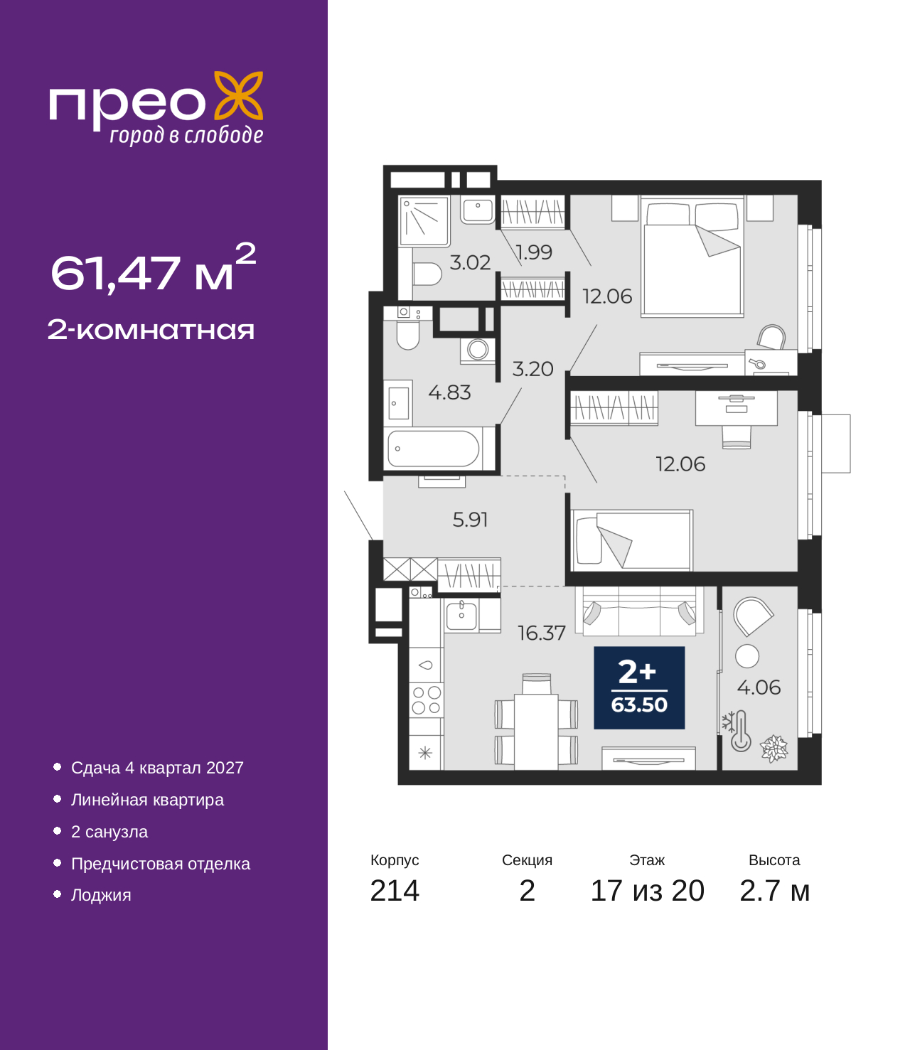 Продается двухкомнатная квартира с предчистовой отделкой в ЖК "Прео" на 17 этаже. Общая площадь: 61.47 кв.м., жилая: 24.12 кв.м., площадь просторной кухни-столовой: 16.37 кв.м. Комнаты изолированные, все окна выходят на одну сторону. В квартире одна лоджия, два совмещенных санузла. Высота потолков 2.7 м. Дом монолитный, двухподъездный, переменной этажности, от 12 до 20 этажей. Квартира находится во 2-й секции высотой 20 этажей в корпусе 214. На этаже 8 квартир. В подъезде 1 пассажирский и 1 грузовой лифт. Окончание строительства - 4 квартал 2027 года. Оформление сделки по договору долевого участия. Преображенский — один из самых привлекательных районов для жизни! Это полностью самостоятельный жилой район с точки зрения инфраструктуры. Преображенский находится между Московским и Червишевским трактами в квартале улиц Закалужская — Вьюжная — Александра Протозанова. Не нужно ждать, когда появится инфраструктура — переезжайте на всё готовое. Вблизи расположены действующие школа и детский сад. В этом году откроется еще один сад, а в следующем году — школа. По соседству с Преображенским запланировано строительство городского парка «Комарово» площадью 38 гектар. За 10 минут можно доехать на автомобиле до крупных ТРЦ: «Лента», «Кристалл», «Леруа Мерлен», «Метро» и «Ашан». С 2018 года в районе открыт Соседский центр — пространство, созданное для формирования добрососедской среды, совместного досуга, общения и реализации соседских инициатив. Здесь проходят встречи соседей, а также сами жители района организовывают мероприятия. Организатором такого события может стать любой желающий. В квартирах выполнена качественная предчистовая отделка. Гладкие стены с финишным выравниванием по маякам. Ровный потолок для установки натяжного потолка. Установлены пятикамерные окна с двойным стеклопакетом (3 стекла). Дизайнерские холлы с видеонаблюдением, безбарьерным и прозрачным входом – всегда светло и спокойно. На первом этаже есть просторные колясочные, где все жители могут оставлять свои коляски и велосипеды. В Преображенском есть всё, что нужно для активного отдыха и занятий спортом. Мы сделали большое футбольное поле с безопасным покрытием. Также установили хоккейный корт, который оборудован по всем необходимым стандартам. Во дворах можно делать упражнения на специальных площадках с турниками. Весь район мы обустроили велодорожками, которые связаны в единый маршрут. У нас есть сухие фонтаны, бьющие из земли, деревья, веревки, сетки, скалодром, газон, песок и резинка — осталось просто дать своему ребенку право на свободную игру. По-настоящему хорошие дворы — это те, которые дети предпочитают соцсетям и телевизору. Аккредитация в банках: ПАО «Банк Уралсиб», ОАО «Альфа-Банк», «Сбербанк России», ПАО «Газпромбанк», ПАО Банк «ВТБ» и других. (AQID02525603)