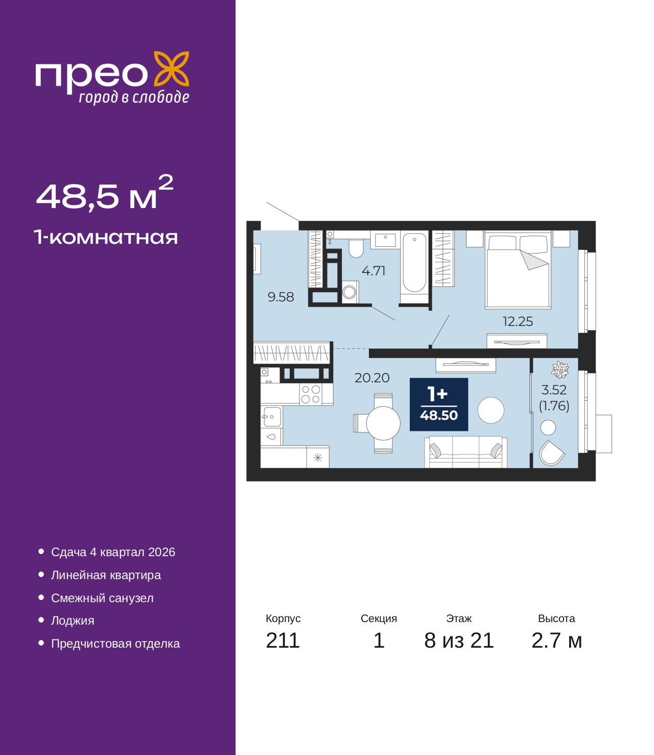 1-комн. квартира от застройщика с предчистовой отделкой в ЖК "Прео" на 8 этаже. Общая площадь: 48.5 кв.м., жилая: 12.25 кв.м., площадь просторной кухни-столовой: 20.2 кв.м. Все окна выходят на одну сторону. В квартире одна лоджия, один совмещенный санузел. Высота потолков 2.7 м. Дом монолитный, черырехподъездный, переменной этажности, от 14 до 21 этажей. Квартира находится в 1-й секции высотой 21 этаж в корпусе 211. На этаже 8 квартир. В подъезде 1 пассажирский и 1 грузовой лифт. Окончание строительства - 4 квартал 2026 года. Оформление сделки по договору долевого участия. Преображенский — один из самых привлекательных районов для жизни! Это полностью самостоятельный жилой район с точки зрения инфраструктуры. Преображенский находится между Московским и Червишевским трактами в квартале улиц Закалужская — Вьюжная — Александра Протозанова. Не нужно ждать, когда появится инфраструктура — переезжайте на всё готовое. Вблизи расположены действующие школа и детский сад. В этом году откроется еще один сад, а в следующем году — школа. По соседству с Преображенским запланировано строительство городского парка «Комарово» площадью 38 гектар. За 10 минут можно доехать на автомобиле до крупных ТРЦ: «Лента», «Кристалл», «Леруа Мерлен», «Метро» и «Ашан». С 2018 года в районе открыт Соседский центр — пространство, созданное для формирования добрососедской среды, совместного досуга, общения и реализации соседских инициатив. Здесь проходят встречи соседей, а также сами жители района организовывают мероприятия. Организатором такого события может стать любой желающий. В квартирах выполнена качественная предчистовая отделка. Гладкие стены с финишным выравниванием по маякам. Ровный потолок для установки натяжного потолка. Установлены пятикамерные окна с двойным стеклопакетом (3 стекла). Дизайнерские холлы с видеонаблюдением, безбарьерным и прозрачным входом – всегда светло и спокойно. На первом этаже есть просторные колясочные, где все жители могут оставлять свои коляски и велосипеды. В Преображенском есть всё, что нужно для активного отдыха и занятий спортом. Мы сделали большое футбольное поле с безопасным покрытием. Также установили хоккейный корт, который оборудован по всем необходимым стандартам. Во дворах можно делать упражнения на специальных площадках с турниками. Весь район мы обустроили велодорожками, которые связаны в единый маршрут. У нас есть сухие фонтаны, бьющие из земли, деревья, веревки, сетки, скалодром, газон, песок и резинка — осталось просто дать своему ребенку право на свободную игру. По-настоящему хорошие дворы — это те, которые дети предпочитают соцсетям и телевизору. Аккредитация в банках: ПАО «Банк Уралсиб», ПАО Банк «ВТБ», ПАО «Газпромбанк», «Сбербанк России», ОАО «Альфа-Банк» и других. (AQID02427590)