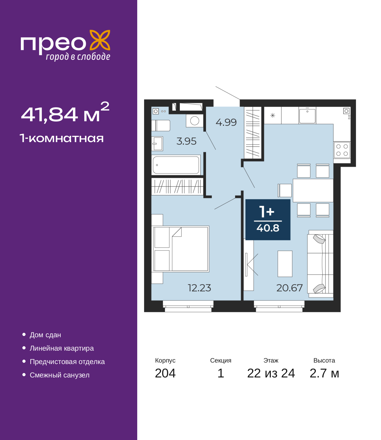 1-комн. квартира с предчистовой отделкой в ЖК "Прео" на 22 этаже. Общая площадь: 41.84 кв.м., жилая: 12.23 кв.м., площадь просторной кухни-столовой: 20.67 кв.м. Все окна выходят на одну сторону. В квартире один совмещенный санузел. Высота потолков 2.7 м. Квартира находится в корпусе 204. Дом монолитный, одноподъездный, высотой 24 этажа. На этаже 14 квартир. В подъезде 2 грузовых лифта. Строительство завершено, дом сдан в 4 квартале 2024 года. Оформление сделки по договору купли-продажи. Преображенский — один из самых привлекательных районов для жизни! Это полностью самостоятельный жилой район с точки зрения инфраструктуры. Преображенский находится между Московским и Червишевским трактами в квартале улиц Закалужская — Вьюжная — Александра Протозанова. Не нужно ждать, когда появится инфраструктура — переезжайте на всё готовое. Вблизи расположены действующие школа и детский сад. В этом году откроется еще один сад, а в следующем году — школа. По соседству с Преображенским запланировано строительство городского парка «Комарово» площадью 38 гектар. За 10 минут можно доехать на автомобиле до крупных ТРЦ: «Лента», «Кристалл», «Леруа Мерлен», «Метро» и «Ашан». С 2018 года в районе открыт Соседский центр — пространство, созданное для формирования добрососедской среды, совместного досуга, общения и реализации соседских инициатив. Здесь проходят встречи соседей, а также сами жители района организовывают мероприятия. Организатором такого события может стать любой желающий. В квартирах выполнена качественная предчистовая отделка. Гладкие стены с финишным выравниванием по маякам. Ровный потолок для установки натяжного потолка. Установлены пятикамерные окна с двойным стеклопакетом (3 стекла). Дизайнерские холлы с видеонаблюдением, безбарьерным и прозрачным входом – всегда светло и спокойно. На первом этаже есть просторные колясочные, где все жители могут оставлять свои коляски и велосипеды. В Преображенском есть всё, что нужно для активного отдыха и занятий спортом. Мы сделали большое футбольное поле с безопасным покрытием. Также установили хоккейный корт, который оборудован по всем необходимым стандартам. Во дворах можно делать упражнения на специальных площадках с турниками. Весь район мы обустроили велодорожками, которые связаны в единый маршрут. У нас есть сухие фонтаны, бьющие из земли, деревья, веревки, сетки, скалодром, газон, песок и резинка — осталось просто дать своему ребенку право на свободную игру. По-настоящему хорошие дворы — это те, которые дети предпочитают соцсетям и телевизору. Аккредитация в банках: ПАО «Банк Уралсиб», ОАО «Альфа-Банк», ПАО «Газпромбанк», «Сбербанк России», ПАО Банк «ВТБ» и других. (AQID02439630)