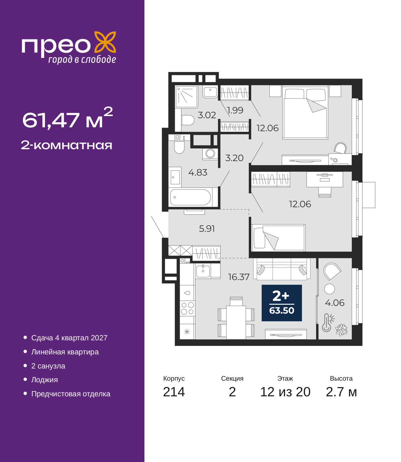 Продается 2-комн. квартира от застройщика с предчистовой отделкой в ЖК "Прео" на 12 этаже. Общая площадь: 61.47 кв.м., жилая: 24.12 кв.м., площадь просторной кухни-столовой: 16.37 кв.м. Комнаты изолированные, все окна выходят на одну сторону. В квартире одна лоджия, два совмещенных санузла. Высота потолков 2.7 м. Дом монолитный, двухподъездный, переменной этажности, от 12 до 20 этажей. Квартира находится во 2-й секции высотой 20 этажей в корпусе 214. На этаже 8 квартир. В подъезде 1 пассажирский и 1 грузовой лифт. Окончание строительства - 4 квартал 2027 года. Оформление сделки по договору долевого участия. Преображенский — один из самых привлекательных районов для жизни! Это полностью самостоятельный жилой район с точки зрения инфраструктуры. Преображенский находится между Московским и Червишевским трактами в квартале улиц Закалужская — Вьюжная — Александра Протозанова. Не нужно ждать, когда появится инфраструктура — переезжайте на всё готовое. Вблизи расположены действующие школа и детский сад. В этом году откроется еще один сад, а в следующем году — школа. По соседству с Преображенским запланировано строительство городского парка «Комарово» площадью 38 гектар. За 10 минут можно доехать на автомобиле до крупных ТРЦ: «Лента», «Кристалл», «Леруа Мерлен», «Метро» и «Ашан». С 2018 года в районе открыт Соседский центр — пространство, созданное для формирования добрососедской среды, совместного досуга, общения и реализации соседских инициатив. Здесь проходят встречи соседей, а также сами жители района организовывают мероприятия. Организатором такого события может стать любой желающий. В квартирах выполнена качественная предчистовая отделка. Гладкие стены с финишным выравниванием по маякам. Ровный потолок для установки натяжного потолка. Установлены пятикамерные окна с двойным стеклопакетом (3 стекла). Дизайнерские холлы с видеонаблюдением, безбарьерным и прозрачным входом – всегда светло и спокойно. На первом этаже есть просторные колясочные, где все жители могут оставлять свои коляски и велосипеды. В Преображенском есть всё, что нужно для активного отдыха и занятий спортом. Мы сделали большое футбольное поле с безопасным покрытием. Также установили хоккейный корт, который оборудован по всем необходимым стандартам. Во дворах можно делать упражнения на специальных площадках с турниками. Весь район мы обустроили велодорожками, которые связаны в единый маршрут. У нас есть сухие фонтаны, бьющие из земли, деревья, веревки, сетки, скалодром, газон, песок и резинка — осталось просто дать своему ребенку право на свободную игру. По-настоящему хорошие дворы — это те, которые дети предпочитают соцсетям и телевизору. Аккредитация в банках: ПАО Банк «ВТБ», ПАО «Газпромбанк», ПАО «Банк Уралсиб», «Сбербанк России», ОАО «Альфа-Банк» и других. (AQID02532814)