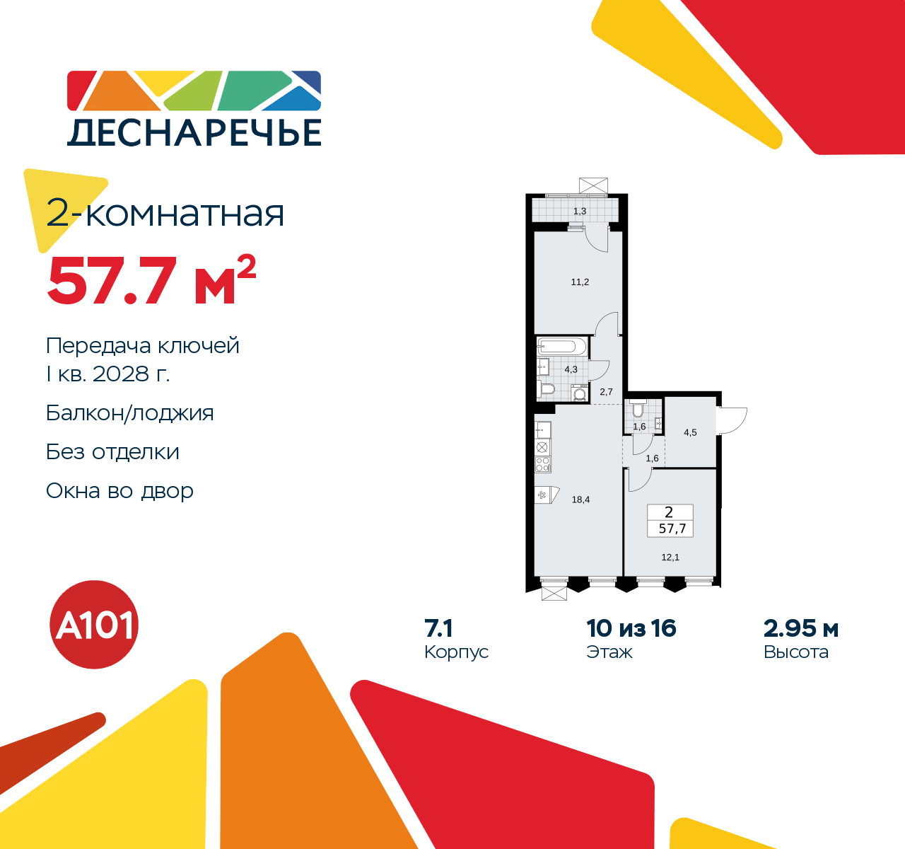2-комн. квартира в ЖК "Деснаречье" на 10 этаже. Квартира без отделки, после выдачи ключей можно делать ремонт. Общая площадь: 57.7 кв.м., жилая: 23.3 кв.м., площадь просторной кухни-столовой: 18.4 кв.м. Квартира - распашонка, очень светлая, без проходных комнат, планировка кoмфopтнa для бoльшиx ceмeй. В квартире одна лоджия, один совмещенный и один раздельный санузел. Высота потолков 2.95 м. Эта квартира предлагается без отделки. Будут установлены стеклопакеты с повышенной тепло- и шумоизоляцией, в квартиру заведены все коммуникации. Вы сможете в полном объеме реализовать ваши идеи обустройства вашего комфортного дома. Для тех, кто ценит время и не хочет дополнительных трат на ремонт мы предлагаем квартиры с предчистовой и дизайнерской отделкой. Дом монолитный, многоподъездный, переменной этажности, от 8 до 16 этажей. Квартира находится в 7-й секции высотой 11 этажей в корпусе 7.1. На этаже 5 квартир. В подъезде 1 пассажирский и 1 грузовой лифт. Начало строительства - 2 квартал 2025 года. Окончание строительства - 1 квартал 2028 года. Оформление сделки по договору долевого участия. Артикул квартиры по базе застройщика 88К-7.1-409. ПРЕДЛОЖЕНИЯ ОТ ЗАСТРОЙЩИКА В ОКТЯБРЕ 2025: Ипотека от 13,9 % для всех! На весь срок. "Семейная ипотека" вернулась. Ставка от 3,5 % на весь срок! Без удорожания! Выгодное ипотечное комбо: Ипотека от 2200 р./мес. и от 6 % после рождения ребёнка! Ипотека для всех "Держи пять!" - ставка 5 % на 2 года! *более подробную информацию по скидкам и акциям уточняйте в отделе продаж Масштабный проект "Деснаречье" на юго-западе Москвы, который включает три новых района («квартала»), объединённые общей идеей – воплотить в реальность мечты современных жителей столицы об интересном, комфортном и разноплановом городском пространстве в окружении рек и лесов, словно сошедших с полотен русских живописцев: - «Берег» оценят все, кому близка водная стихия: плеск волн, солнечные блики и прогулки вдоль тихого течения речи. - «Лес» утопает в зелени парков и лесов. Здесь соблюдён идеальный баланс загородного спокойствия и столичного комфорта. - «Парк», самый энергичный и яркий, отличается высокой концентрацией пространств для спорта и творчества. Жилой комплекс "Деснаречье" расположится в 12 км от МКАД по современному Калужскому шоссе. Внешний облик зданий соответствует современному стилю и стандартам, характерным и для других популярных проектов ГК «А101»: сочетание контрастных тонов, большое количество остекления, в котором отражается небо, гармония с природным окружением. Весь город - в вашем районе. Находиться на территории «15-минутного города» значит иметь всё необходимое для полноценной жизни в шаговой доступности. Маршруты в районе «Деснаречье» выстроены так, чтобы добраться до магазинов, парков, школ, салонов услуг и других объектов можно было всего за несколько минут пешком или на велосипеде. Двор закрытый от машин – это тишина, комфорт и безопасность, поэтому все машино-места (включая «семейные» и увеличенные, с возможностью установки роллетных шкафов) находятся в подземном паркинге. В паркинги можно спуститься на лифте из любого подъезда или по лестнице. Рядом с «Деснаречьем» в 2027 году планируется открытие станции метро «Десна», до которой будет удобно добраться пешком или на велосипеде. Дорога на автомобиле до перехватывающих парковок станций «Ольховая» и «Прокшино» за