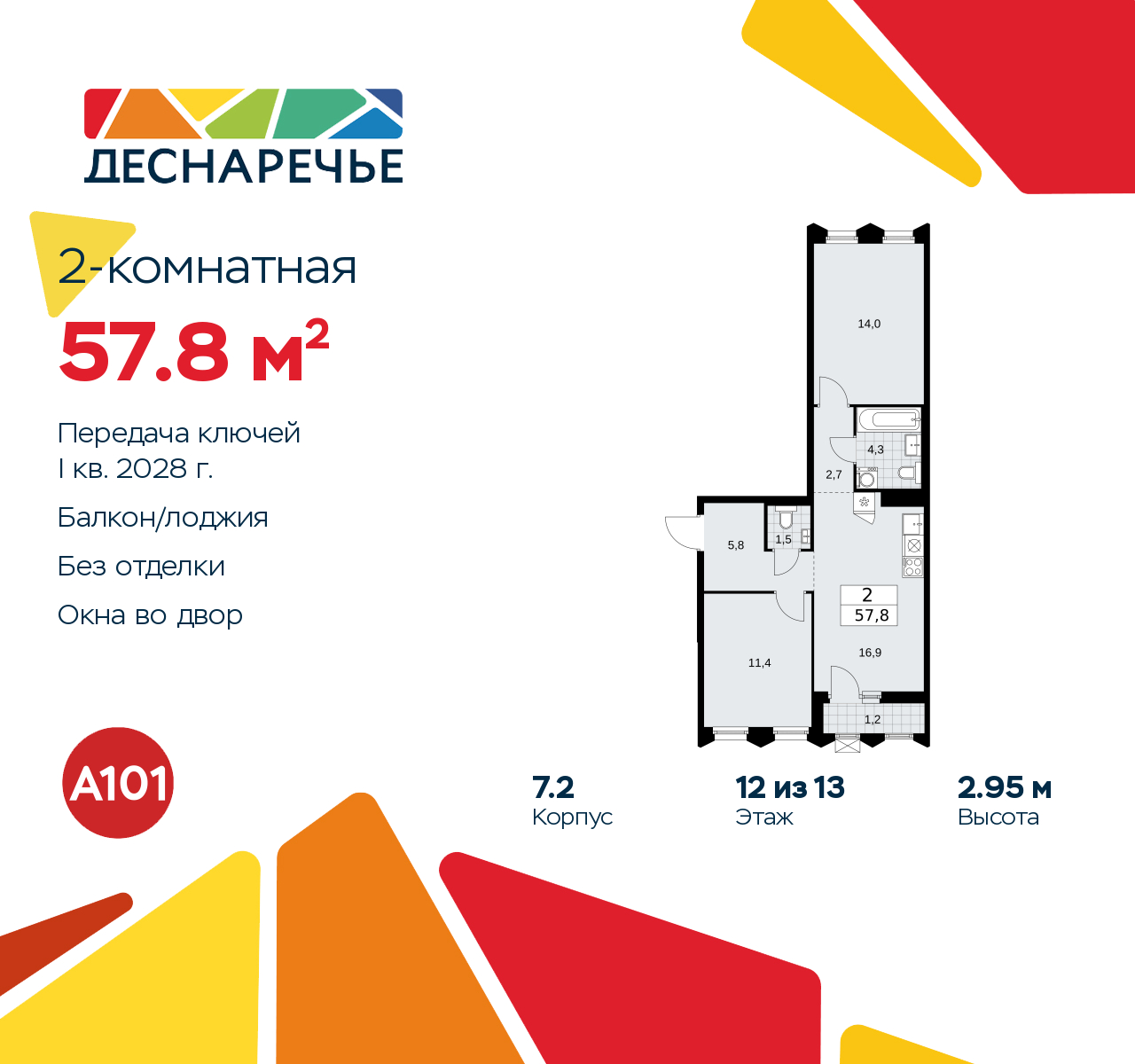 Просторная 2-комн. квартира в ЖК "Деснаречье" на 12 этаже. Квартира без отделки, после оформления собственности можно делать ремонт. Общая площадь: 57.8 кв.м., жилая: 25.4 кв.м., площадь просторной кухни-столовой: 16.9 кв.м. Квартира - распашонка, без проходных комнат, окна выходят на paзные стороны дома. В квартире одна лоджия, один совмещенный и один раздельный санузел. Высота потолков 2.95 м. Эта квартира предлагается без отделки. Будут установлены стеклопакеты с повышенной тепло- и шумоизоляцией, в квартиру заведены все коммуникации. Вы сможете в полном объеме реализовать ваши идеи обустройства вашего комфортного дома. Для тех, кто ценит время и не хочет дополнительных трат на ремонт мы предлагаем квартиры с предчистовой и дизайнерской отделкой. Дом монолитный, двухподъездный, высотой 13 этажей. Квартира находится в 1-й секции в корпусе 7.2. На этаже 5 квартир. В подъезде 1 пассажирский и 1 грузовой лифт. Начало строительства - 2 квартал 2025 года. Окончание строительства - 1 квартал 2028 года. Оформление сделки по договору долевого участия. Артикул квартиры по базе застройщика 88К-7.2-523. ПРЕДЛОЖЕНИЯ ОТ ЗАСТРОЙЩИКА В ОКТЯБРЕ 2025: Ипотека от 13,9 % для всех! На весь срок. "Семейная ипотека" вернулась. Ставка от 3,5 % на весь срок! Без удорожания! Выгодное ипотечное комбо: Ипотека от 2200 р./мес. и от 6 % после рождения ребёнка! Ипотека для всех "Держи пять!" - ставка 5 % на 2 года! *более подробную информацию по скидкам и акциям уточняйте в отделе продаж Масштабный проект "Деснаречье" на юго-западе Москвы, который включает три новых района («квартала»), объединённые общей идеей – воплотить в реальность мечты современных жителей столицы об интересном, комфортном и разноплановом городском пространстве в окружении рек и лесов, словно сошедших с полотен русских живописцев: - «Берег» оценят все, кому близка водная стихия: плеск волн, солнечные блики и прогулки вдоль тихого течения речи. - «Лес» утопает в зелени парков и лесов. Здесь соблюдён идеальный баланс загородного спокойствия и столичного комфорта. - «Парк», самый энергичный и яркий, отличается высокой концентрацией пространств для спорта и творчества. Жилой комплекс "Деснаречье" расположится в 12 км от МКАД по современному Калужскому шоссе. Внешний облик зданий соответствует современному стилю и стандартам, характерным и для других популярных проектов ГК «А101»: сочетание контрастных тонов, большое количество остекления, в котором отражается небо, гармония с природным окружением. Весь город - в вашем районе. Находиться на территории «15-минутного города» значит иметь всё необходимое для полноценной жизни в шаговой доступности. Маршруты в районе «Деснаречье» выстроены так, чтобы добраться до магазинов, парков, школ, салонов услуг и других объектов можно было всего за несколько минут пешком или на велосипеде. Двор закрытый от машин – это тишина, комфорт и безопасность, поэтому все машино-места (включая «семейные» и увеличенные, с возможностью установки роллетных шкафов) находятся в подземном паркинге. В паркинги можно спуститься на лифте из любого подъезда или по лестнице. Рядом с «Деснаречьем» в 2027 году планируется открытие станции метро «Десна», до которой будет удобно добраться пешком или на велосипеде. Дорога на автомобиле до перехватывающих парковок станций «Ольховая» и «Прокшино» займёт около 10 минут. В процессе 