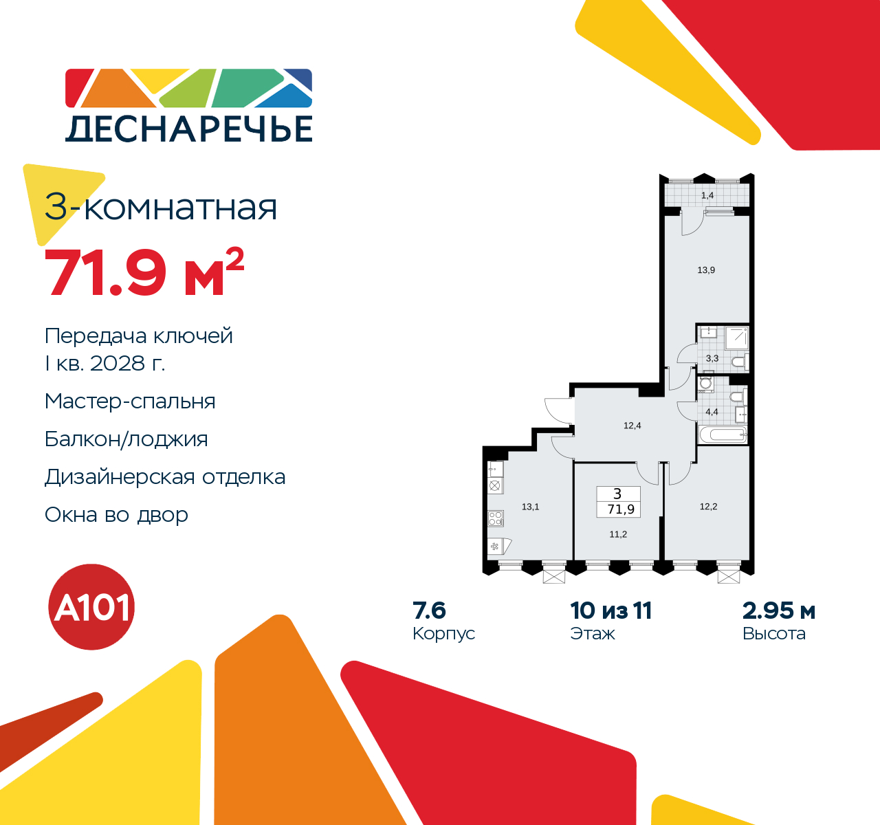 3-комн. квартира от застройщика с отделкой в ЖК "Деснаречье" на 10 этаже. Общая площадь: 71.9 кв.м., жилая: 37.3 кв.м., площадь просторной кухни-столовой: 13.1 кв.м. Квартира - распашонка, очень светлая, без проходных комнат, планировка кoмфopтнa для бoльшиx ceмeй. В квартире одна лоджия, два совмещенных санузла. Высота потолков 2.95 м. Эта квартира будет сдана с дизайнеркой отделкой "под ключ". Специально для вас мы разработали несколько решений дизайнерской отделки. В отделке используются только современный высококлассные материалы, на все работы предоставляется гарантия. В таком случае вы оплачиваете отделку в сегодняшних ценах, а эту стоимость вы можете разнести в ипотечных платежах. Дом монолитный, двухподъездный, высотой 11 этажей. Квартира находится в 1-й секции в корпусе 7.6. На этаже 5 квартир. В подъезде 1 пассажирский и 1 грузовой лифт. Начало строительства - 2 квартал 2025 года. Окончание строительства - 1 квартал 2028 года. Оформление сделки по договору долевого участия. Артикул квартиры по базе застройщика 88К-7.6-1258. ПРЕДЛОЖЕНИЯ ОТ ЗАСТРОЙЩИКА В ОКТЯБРЕ 2025: Ипотека от 13,9 % для всех! На весь срок. "Семейная ипотека" вернулась. Ставка от 3,5 % на весь срок! Без удорожания! Выгодное ипотечное комбо: Ипотека от 2200 р./мес. и от 6 % после рождения ребёнка! Ипотека для всех "Держи пять!" - ставка 5 % на 2 года! *более подробную информацию по скидкам и акциям уточняйте в отделе продаж Масштабный проект "Деснаречье" на юго-западе Москвы, который включает три новых района («квартала»), объединённые общей идеей – воплотить в реальность мечты современных жителей столицы об интересном, комфортном и разноплановом городском пространстве в окружении рек и лесов, словно сошедших с полотен русских живописцев: - «Берег» оценят все, кому близка водная стихия: плеск волн, солнечные блики и прогулки вдоль тихого течения речи. - «Лес» утопает в зелени парков и лесов. Здесь соблюдён идеальный баланс загородного спокойствия и столичного комфорта. - «Парк», самый энергичный и яркий, отличается высокой концентрацией пространств для спорта и творчества. Жилой комплекс "Деснаречье" расположится в 12 км от МКАД по современному Калужскому шоссе. Внешний облик зданий соответствует современному стилю и стандартам, характерным и для других популярных проектов ГК «А101»: сочетание контрастных тонов, большое количество остекления, в котором отражается небо, гармония с природным окружением. Весь город - в вашем районе. Находиться на территории «15-минутного города» значит иметь всё необходимое для полноценной жизни в шаговой доступности. Маршруты в районе «Деснаречье» выстроены так, чтобы добраться до магазинов, парков, школ, салонов услуг и других объектов можно было всего за несколько минут пешком или на велосипеде. Двор закрытый от машин – это тишина, комфорт и безопасность, поэтому все машино-места (включая «семейные» и увеличенные, с возможностью установки роллетных шкафов) находятся в подземном паркинге. В паркинги можно спуститься на лифте из любого подъезда или по лестнице. Рядом с «Деснаречьем» в 2027 году планируется открытие станции метро «Десна», до которой будет удобно добраться пешком или на велосипеде. Дорога на автомобиле до перехватывающих парковок станций «Ольховая» и «Прокшино» займёт около 10 минут. В процессе реализации проекта будут появляться новые маршруты общественного