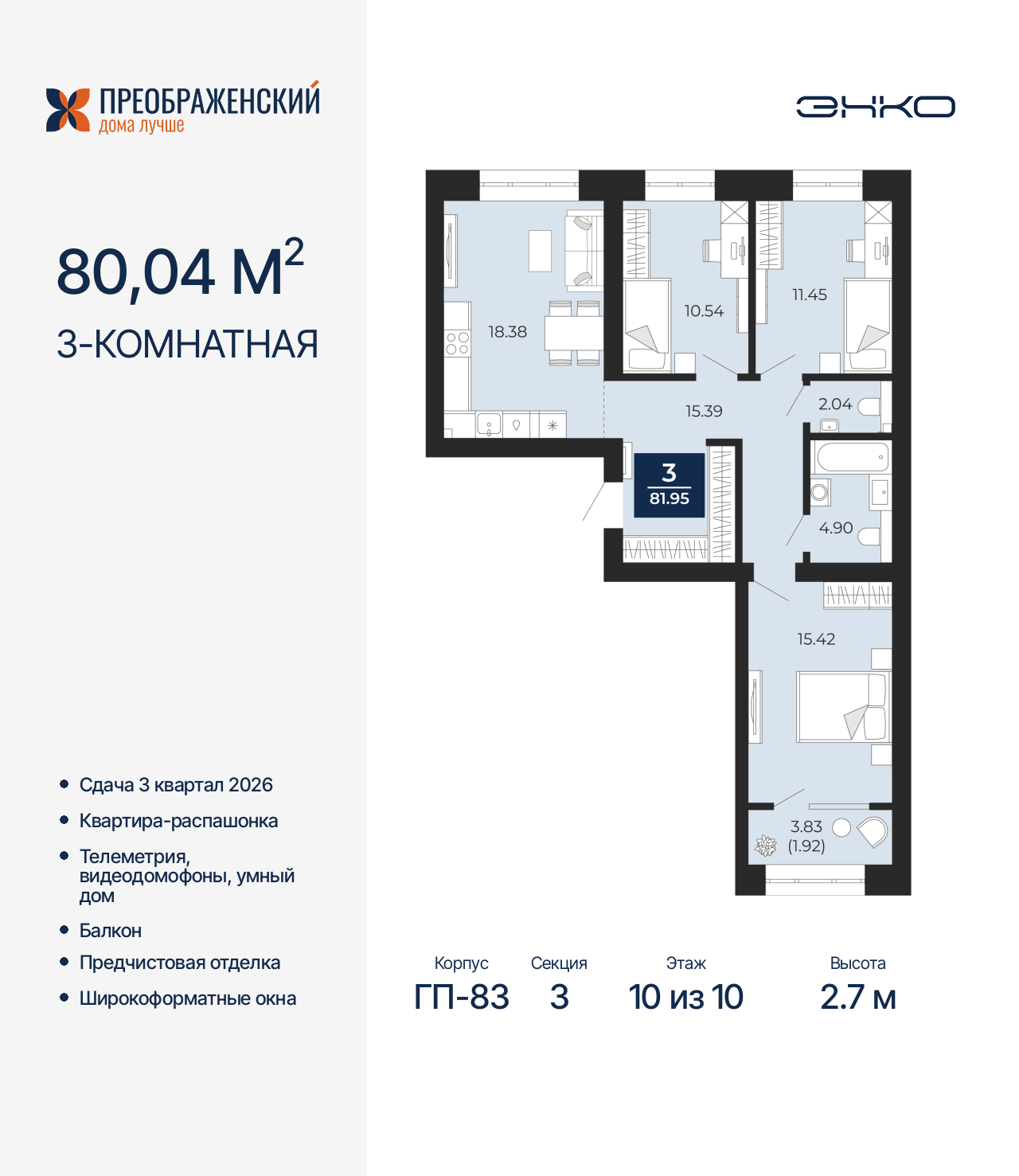 3-комн. квартира от застройщика с предчистовой отделкой в ЖК "Преображенский" на 10 этаже. Общая площадь: 80.04 кв.м., жилая: 37.41 кв.м., площадь просторной кухни-столовой: 18.38 кв.м. Квартира - распашонка, без проходных комнат, окна выходят на paзные стороны дома. В квартире один балкон, один совмещенный и один раздельный санузел. Высота потолков 2.7 м. Дом монолитный, многоподъездный, переменной этажности, от 8 до 12 этажей. Квартира находится в 3-й секции высотой 10 этажей в корпусе ГП-83. На этаже 4 квартиры. В подъезде 1 пассажирский и 1 грузовой лифт. Начало строительства - 4 квартал 2023 года. Окончание строительства - 3 квартал 2026 года. Оформление сделки по договору долевого участия. Квартал будет расположен в микрорайоне Славянский на пересечении улиц Мира и 70-летия Октября. Престижный район, собственный парк, вся необходимая для жизни, учёбы и работы инфраструктура — новая школа с бассейном и кванториумом, новый детский сад, поликлиника, спорткомплекс, магазины и др. Чтобы в квартирах было как можно больше свободного пространства, мы предусмотрели индивидуальные кладовые на цокольном этаже. Оставляйте коляски и сезонный спортинвентарь после прогулок здесь — удобно для вас и чисто для квартиры. В подземный паркинг можно спуститься на лифте прямо с квартирной площадки. (AQID02484201)