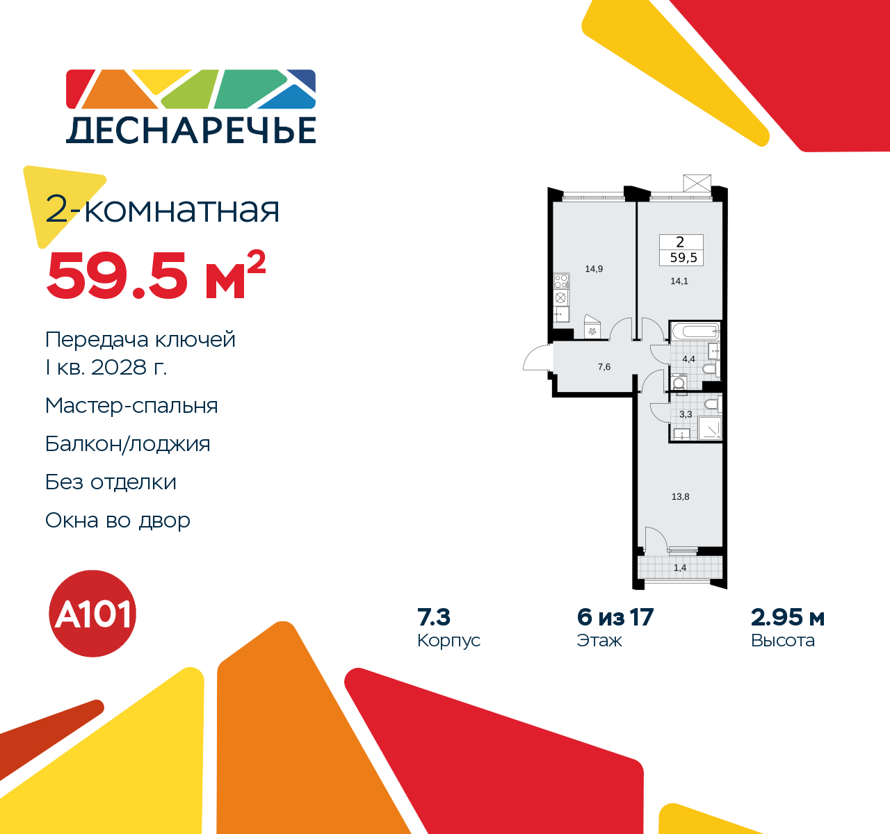 Двухкомнатная квартира в ЖК "Деснаречье" на 6 этаже. Квартира без отделки, полностью готова к ремонту. Общая площадь: 59.5 кв.м., жилая: 27.9 кв.м., площадь просторной кухни-столовой: 14.9 кв.м. Квартира - распашонка, без проходных комнат, окна выходят на paзные стороны дома. В квартире одна лоджия, два совмещенных санузла. Высота потолков 2.95 м. Эта квартира предлагается без отделки. Будут установлены стеклопакеты с повышенной тепло- и шумоизоляцией, в квартиру заведены все коммуникации. Вы сможете в полном объеме реализовать ваши идеи обустройства вашего комфортного дома. Для тех, кто ценит время и не хочет дополнительных трат на ремонт мы предлагаем квартиры с предчистовой и дизайнерской отделкой. Дом монолитный, черырехподъездный, переменной этажности, от 9 до 17 этажей. Квартира находится в 1-й секции высотой 15 этажей в корпусе 7.3. На этаже 5 квартир. В подъезде 1 пассажирский и 1 грузовой лифт. Начало строительства - 2 квартал 2025 года. Окончание строительства - 1 квартал 2028 года. Оформление сделки по договору долевого участия. Артикул квартиры по базе застройщика 88К-7.3-609. ПРЕДЛОЖЕНИЯ ОТ ЗАСТРОЙЩИКА В ОКТЯБРЕ 2025: Ипотека от 13,9 % для всех! На весь срок. "Семейная ипотека" вернулась. Ставка от 3,5 % на весь срок! Без удорожания! Выгодное ипотечное комбо: Ипотека от 2200 р./мес. и от 6 % после рождения ребёнка! Ипотека для всех "Держи пять!" - ставка 5 % на 2 года! *более подробную информацию по скидкам и акциям уточняйте в отделе продаж Масштабный проект "Деснаречье" на юго-западе Москвы, который включает три новых района («квартала»), объединённые общей идеей – воплотить в реальность мечты современных жителей столицы об интересном, комфортном и разноплановом городском пространстве в окружении рек и лесов, словно сошедших с полотен русских живописцев: - «Берег» оценят все, кому близка водная стихия: плеск волн, солнечные блики и прогулки вдоль тихого течения речи. - «Лес» утопает в зелени парков и лесов. Здесь соблюдён идеальный баланс загородного спокойствия и столичного комфорта. - «Парк», самый энергичный и яркий, отличается высокой концентрацией пространств для спорта и творчества. Жилой комплекс "Деснаречье" расположится в 12 км от МКАД по современному Калужскому шоссе. Внешний облик зданий соответствует современному стилю и стандартам, характерным и для других популярных проектов ГК «А101»: сочетание контрастных тонов, большое количество остекления, в котором отражается небо, гармония с природным окружением. Весь город - в вашем районе. Находиться на территории «15-минутного города» значит иметь всё необходимое для полноценной жизни в шаговой доступности. Маршруты в районе «Деснаречье» выстроены так, чтобы добраться до магазинов, парков, школ, салонов услуг и других объектов можно было всего за несколько минут пешком или на велосипеде. Двор закрытый от машин – это тишина, комфорт и безопасность, поэтому все машино-места (включая «семейные» и увеличенные, с возможностью установки роллетных шкафов) находятся в подземном паркинге. В паркинги можно спуститься на лифте из любого подъезда или по лестнице. Рядом с «Деснаречьем» в 2027 году планируется открытие станции метро «Десна», до которой будет удобно добраться пешком или на велосипеде. Дорога на автомобиле до перехватывающих парковок станций «Ольховая» и «Прокшино» займёт около 10 минут. В процессе реализ