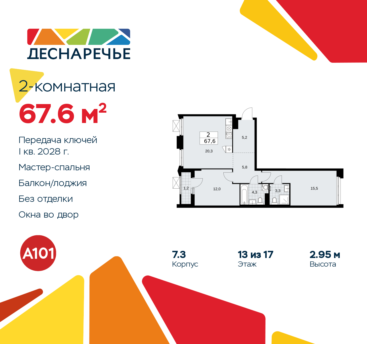 2-комн. квартира в ЖК "Деснаречье" на 13 этаже. Квартира без отделки, полностью готова к ремонту. Общая площадь: 67.6 кв.м., жилая: 27.5 кв.м., площадь просторной кухни-столовой: 20.3 кв.м. Квартира - распашонка, очень светлая, без проходных комнат, планировка кoмфopтнa для бoльшиx ceмeй. В квартире одна лоджия, два совмещенных санузла. Высота потолков 2.95 м. Эта квартира предлагается без отделки. Будут установлены стеклопакеты с повышенной тепло- и шумоизоляцией, в квартиру заведены все коммуникации. Вы сможете в полном объеме реализовать ваши идеи обустройства вашего комфортного дома. Для тех, кто ценит время и не хочет дополнительных трат на ремонт мы предлагаем квартиры с предчистовой и дизайнерской отделкой. Дом монолитный, черырехподъездный, переменной этажности, от 9 до 17 этажей. Квартира находится в 3-й секции высотой 17 этажей в корпусе 7.3. На этаже 5 квартир. В подъезде 1 пассажирский и 1 грузовой лифт. Начало строительства - 2 квартал 2025 года. Окончание строительства - 1 квартал 2028 года. Оформление сделки по договору долевого участия. Артикул квартиры по базе застройщика 88К-7.3-770. ПРЕДЛОЖЕНИЯ ОТ ЗАСТРОЙЩИКА В ОКТЯБРЕ 2025: Ипотека от 13,9 % для всех! На весь срок. "Семейная ипотека" вернулась. Ставка от 3,5 % на весь срок! Без удорожания! Выгодное ипотечное комбо: Ипотека от 2200 р./мес. и от 6 % после рождения ребёнка! Ипотека для всех "Держи пять!" - ставка 5 % на 2 года! *более подробную информацию по скидкам и акциям уточняйте в отделе продаж Масштабный проект "Деснаречье" на юго-западе Москвы, который включает три новых района («квартала»), объединённые общей идеей – воплотить в реальность мечты современных жителей столицы об интересном, комфортном и разноплановом городском пространстве в окружении рек и лесов, словно сошедших с полотен русских живописцев: - «Берег» оценят все, кому близка водная стихия: плеск волн, солнечные блики и прогулки вдоль тихого течения речи. - «Лес» утопает в зелени парков и лесов. Здесь соблюдён идеальный баланс загородного спокойствия и столичного комфорта. - «Парк», самый энергичный и яркий, отличается высокой концентрацией пространств для спорта и творчества. Жилой комплекс "Деснаречье" расположится в 12 км от МКАД по современному Калужскому шоссе. Внешний облик зданий соответствует современному стилю и стандартам, характерным и для других популярных проектов ГК «А101»: сочетание контрастных тонов, большое количество остекления, в котором отражается небо, гармония с природным окружением. Весь город - в вашем районе. Находиться на территории «15-минутного города» значит иметь всё необходимое для полноценной жизни в шаговой доступности. Маршруты в районе «Деснаречье» выстроены так, чтобы добраться до магазинов, парков, школ, салонов услуг и других объектов можно было всего за несколько минут пешком или на велосипеде. Двор закрытый от машин – это тишина, комфорт и безопасность, поэтому все машино-места (включая «семейные» и увеличенные, с возможностью установки роллетных шкафов) находятся в подземном паркинге. В паркинги можно спуститься на лифте из любого подъезда или по лестнице. Рядом с «Деснаречьем» в 2027 году планируется открытие станции метро «Десна», до которой будет удобно добраться пешком или на велосипеде. Дорога на автомобиле до перехватывающих парковок станций «Ольховая» и «Прокшино» займёт около 10 минут. В процессе 