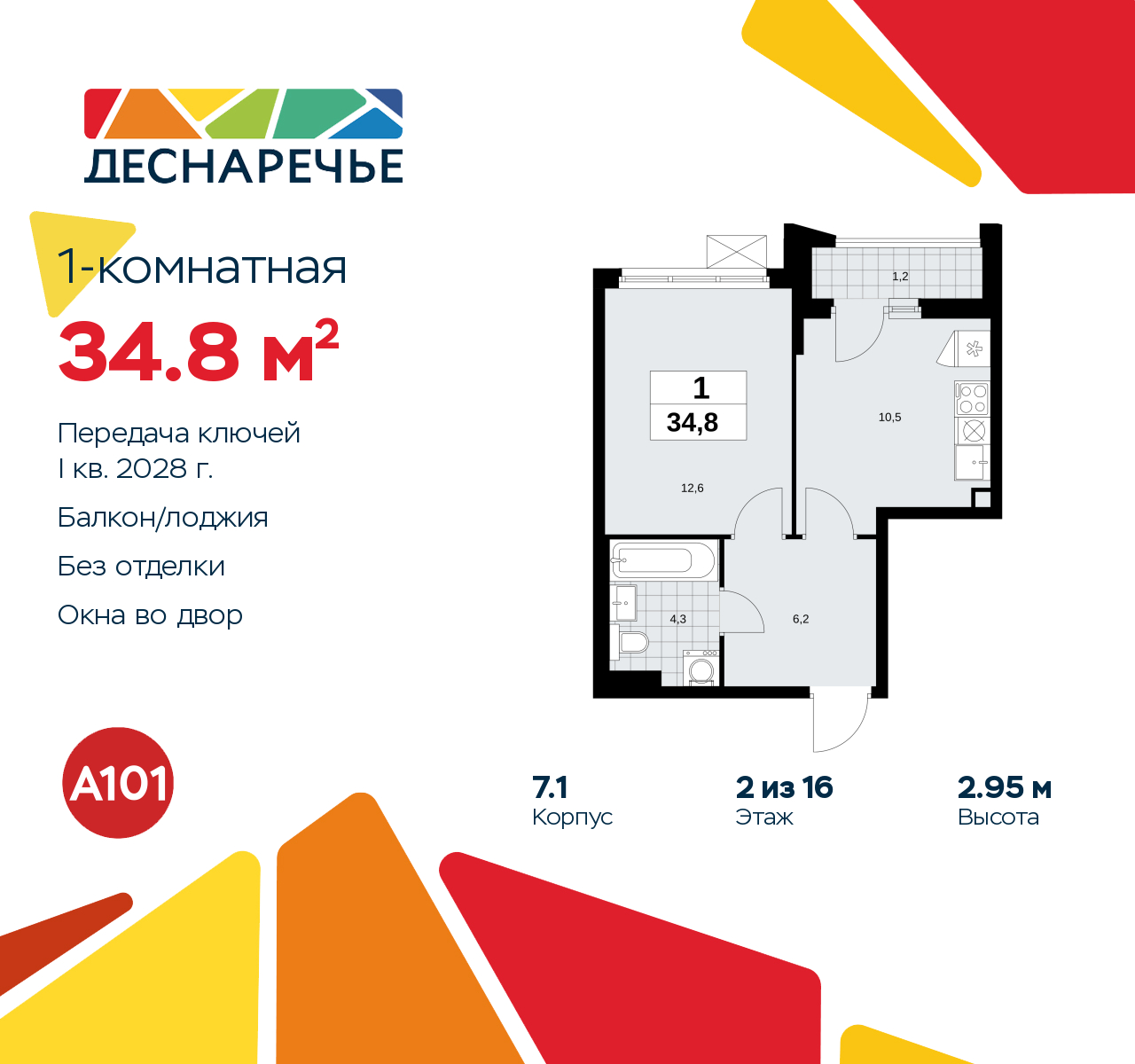 1-комн. квартира в ЖК "Деснаречье" на 2 этаже. Квартира без отделки, новый собственник может сделать ремонт по своему дизайн-проекту. Общая площадь: 34.8 кв.м., жилая: 12.6 кв.м., площадь просторной кухни-столовой: 10.5 кв.м. Все окна выходят на одну сторону. В квартире одна лоджия, один совмещенный санузел. Высота потолков 2.95 м. Эта квартира предлагается без отделки. Будут установлены стеклопакеты с повышенной тепло- и шумоизоляцией, в квартиру заведены все коммуникации. Вы сможете в полном объеме реализовать ваши идеи обустройства вашего комфортного дома. Для тех, кто ценит время и не хочет дополнительных трат на ремонт мы предлагаем квартиры с предчистовой и дизайнерской отделкой. Дом монолитный, многоподъездный, переменной этажности, от 8 до 16 этажей. Квартира находится в 7-й секции высотой 11 этажей в корпусе 7.1. На этаже 5 квартир. В подъезде 1 пассажирский и 1 грузовой лифт. Начало строительства - 2 квартал 2025 года. Окончание строительства - 1 квартал 2028 года. Оформление сделки по договору долевого участия. Артикул квартиры по базе застройщика 88К-7.1-370. ПРЕДЛОЖЕНИЯ ОТ ЗАСТРОЙЩИКА В ОКТЯБРЕ 2025: Ипотека от 13,9 % для всех! На весь срок. "Семейная ипотека" вернулась. Ставка от 3,5 % на весь срок! Без удорожания! Выгодное ипотечное комбо: Ипотека от 2200 р./мес. и от 6 % после рождения ребёнка! Ипотека для всех "Держи пять!" - ставка 5 % на 2 года! *более подробную информацию по скидкам и акциям уточняйте в отделе продаж Масштабный проект "Деснаречье" на юго-западе Москвы, который включает три новых района («квартала»), объединённые общей идеей – воплотить в реальность мечты современных жителей столицы об интересном, комфортном и разноплановом городском пространстве в окружении рек и лесов, словно сошедших с полотен русских живописцев: - «Берег» оценят все, кому близка водная стихия: плеск волн, солнечные блики и прогулки вдоль тихого течения речи. - «Лес» утопает в зелени парков и лесов. Здесь соблюдён идеальный баланс загородного спокойствия и столичного комфорта. - «Парк», самый энергичный и яркий, отличается высокой концентрацией пространств для спорта и творчества. Жилой комплекс "Деснаречье" расположится в 12 км от МКАД по современному Калужскому шоссе. Внешний облик зданий соответствует современному стилю и стандартам, характерным и для других популярных проектов ГК «А101»: сочетание контрастных тонов, большое количество остекления, в котором отражается небо, гармония с природным окружением. Весь город - в вашем районе. Находиться на территории «15-минутного города» значит иметь всё необходимое для полноценной жизни в шаговой доступности. Маршруты в районе «Деснаречье» выстроены так, чтобы добраться до магазинов, парков, школ, салонов услуг и других объектов можно было всего за несколько минут пешком или на велосипеде. Двор закрытый от машин – это тишина, комфорт и безопасность, поэтому все машино-места (включая «семейные» и увеличенные, с возможностью установки роллетных шкафов) находятся в подземном паркинге. В паркинги можно спуститься на лифте из любого подъезда или по лестнице. Рядом с «Деснаречьем» в 2027 году планируется открытие станции метро «Десна», до которой будет удобно добраться пешком или на велосипеде. Дорога на автомобиле до перехватывающих парковок станций «Ольховая» и «Прокшино» займёт около 10 минут. В процессе реализации проекта будут