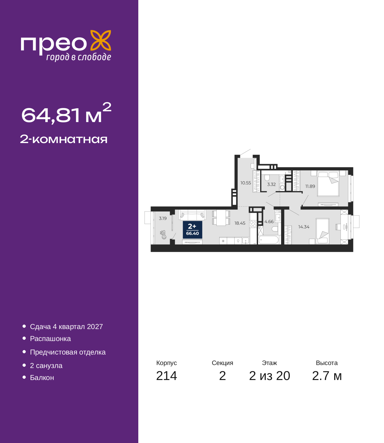 Продается 2-комн. квартира от застройщика с предчистовой отделкой в ЖК "Прео" на 2 этаже. Общая площадь: 64.81 кв.м., жилая: 26.23 кв.м., площадь просторной кухни-столовой: 18.45 кв.м. Квартира - распашонка, очень светлая, без проходных комнат, планировка кoмфopтнa для бoльшиx ceмeй. В квартире один балкон, один совмещенный и один раздельный санузел. Высота потолков 2.7 м. Дом монолитный, двухподъездный, переменной этажности, от 12 до 20 этажей. Квартира находится во 2-й секции высотой 20 этажей в корпусе 214. На этаже 8 квартир. В подъезде 1 пассажирский и 1 грузовой лифт. Окончание строительства - 4 квартал 2027 года. Оформление сделки по договору долевого участия. Преображенский — один из самых привлекательных районов для жизни! Это полностью самостоятельный жилой район с точки зрения инфраструктуры. Преображенский находится между Московским и Червишевским трактами в квартале улиц Закалужская — Вьюжная — Александра Протозанова. Не нужно ждать, когда появится инфраструктура — переезжайте на всё готовое. Вблизи расположены действующие школа и детский сад. В этом году откроется еще один сад, а в следующем году — школа. По соседству с Преображенским запланировано строительство городского парка «Комарово» площадью 38 гектар. За 10 минут можно доехать на автомобиле до крупных ТРЦ: «Лента», «Кристалл», «Леруа Мерлен», «Метро» и «Ашан». С 2018 года в районе открыт Соседский центр — пространство, созданное для формирования добрососедской среды, совместного досуга, общения и реализации соседских инициатив. Здесь проходят встречи соседей, а также сами жители района организовывают мероприятия. Организатором такого события может стать любой желающий. В квартирах выполнена качественная предчистовая отделка. Гладкие стены с финишным выравниванием по маякам. Ровный потолок для установки натяжного потолка. Установлены пятикамерные окна с двойным стеклопакетом (3 стекла). Дизайнерские холлы с видеонаблюдением, безбарьерным и прозрачным входом – всегда светло и спокойно. На первом этаже есть просторные колясочные, где все жители могут оставлять свои коляски и велосипеды. В Преображенском есть всё, что нужно для активного отдыха и занятий спортом. Мы сделали большое футбольное поле с безопасным покрытием. Также установили хоккейный корт, который оборудован по всем необходимым стандартам. Во дворах можно делать упражнения на специальных площадках с турниками. Весь район мы обустроили велодорожками, которые связаны в единый маршрут. У нас есть сухие фонтаны, бьющие из земли, деревья, веревки, сетки, скалодром, газон, песок и резинка — осталось просто дать своему ребенку право на свободную игру. По-настоящему хорошие дворы — это те, которые дети предпочитают соцсетям и телевизору. Аккредитация в банках: ПАО «Газпромбанк», ПАО Банк «ВТБ», ПАО «Банк Уралсиб», «Сбербанк России», ОАО «Альфа-Банк» и других. (AQID02525564)