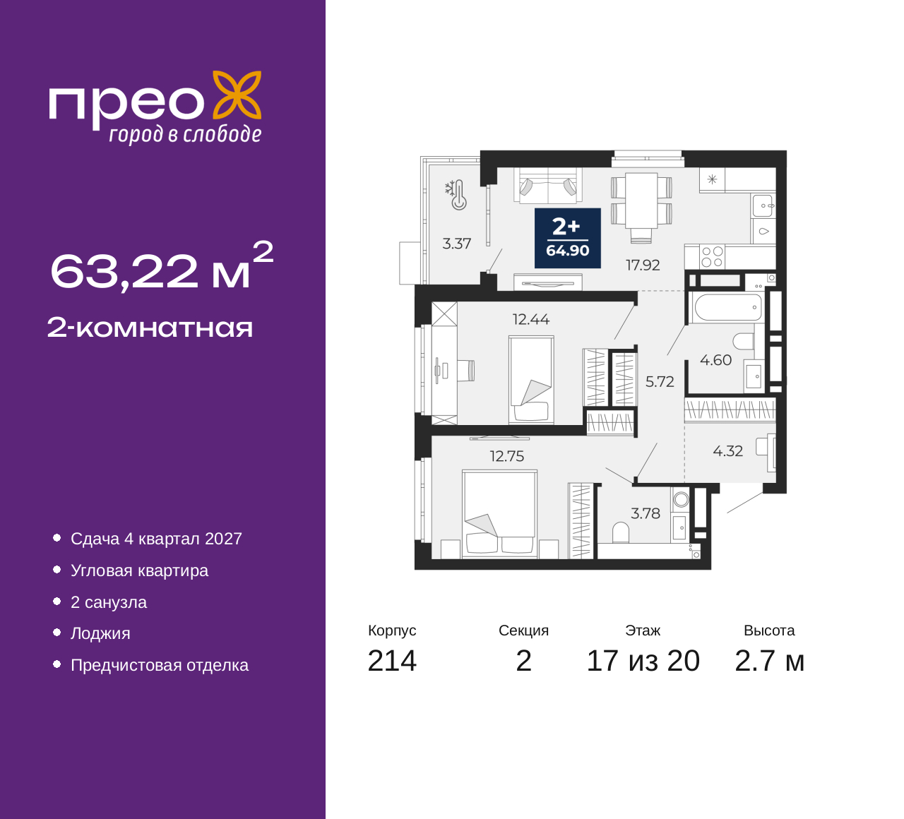 Продается 2-комн. квартира от застройщика с предчистовой отделкой в ЖК "Прео" на 17 этаже. Общая площадь: 63.22 кв.м., жилая: 25.19 кв.м., площадь просторной кухни-столовой: 17.92 кв.м. Угловая квартира, окна oбecпeчивaют paвнoмepнoe ocвeщeниe в тeчeниe дня. В квартире одна лоджия, один совмещенный и один раздельный санузел. Высота потолков 2.7 м. Дом монолитный, двухподъездный, переменной этажности, от 12 до 20 этажей. Квартира находится во 2-й секции высотой 20 этажей в корпусе 214. На этаже 8 квартир. В подъезде 1 пассажирский и 1 грузовой лифт. Окончание строительства - 4 квартал 2027 года. Оформление сделки по договору долевого участия. Преображенский — один из самых привлекательных районов для жизни! Это полностью самостоятельный жилой район с точки зрения инфраструктуры. Преображенский находится между Московским и Червишевским трактами в квартале улиц Закалужская — Вьюжная — Александра Протозанова. Не нужно ждать, когда появится инфраструктура — переезжайте на всё готовое. Вблизи расположены действующие школа и детский сад. В этом году откроется еще один сад, а в следующем году — школа. По соседству с Преображенским запланировано строительство городского парка «Комарово» площадью 38 гектар. За 10 минут можно доехать на автомобиле до крупных ТРЦ: «Лента», «Кристалл», «Леруа Мерлен», «Метро» и «Ашан». С 2018 года в районе открыт Соседский центр — пространство, созданное для формирования добрососедской среды, совместного досуга, общения и реализации соседских инициатив. Здесь проходят встречи соседей, а также сами жители района организовывают мероприятия. Организатором такого события может стать любой желающий. В квартирах выполнена качественная предчистовая отделка. Гладкие стены с финишным выравниванием по маякам. Ровный потолок для установки натяжного потолка. Установлены пятикамерные окна с двойным стеклопакетом (3 стекла). Дизайнерские холлы с видеонаблюдением, безбарьерным и прозрачным входом – всегда светло и спокойно. На первом этаже есть просторные колясочные, где все жители могут оставлять свои коляски и велосипеды. В Преображенском есть всё, что нужно для активного отдыха и занятий спортом. Мы сделали большое футбольное поле с безопасным покрытием. Также установили хоккейный корт, который оборудован по всем необходимым стандартам. Во дворах можно делать упражнения на специальных площадках с турниками. Весь район мы обустроили велодорожками, которые связаны в единый маршрут. У нас есть сухие фонтаны, бьющие из земли, деревья, веревки, сетки, скалодром, газон, песок и резинка — осталось просто дать своему ребенку право на свободную игру. По-настоящему хорошие дворы — это те, которые дети предпочитают соцсетям и телевизору. Аккредитация в банках: «Сбербанк России», ОАО «Альфа-Банк», ПАО «Газпромбанк», ПАО «Банк Уралсиб», ПАО Банк «ВТБ» и других. (AQID02525620)
