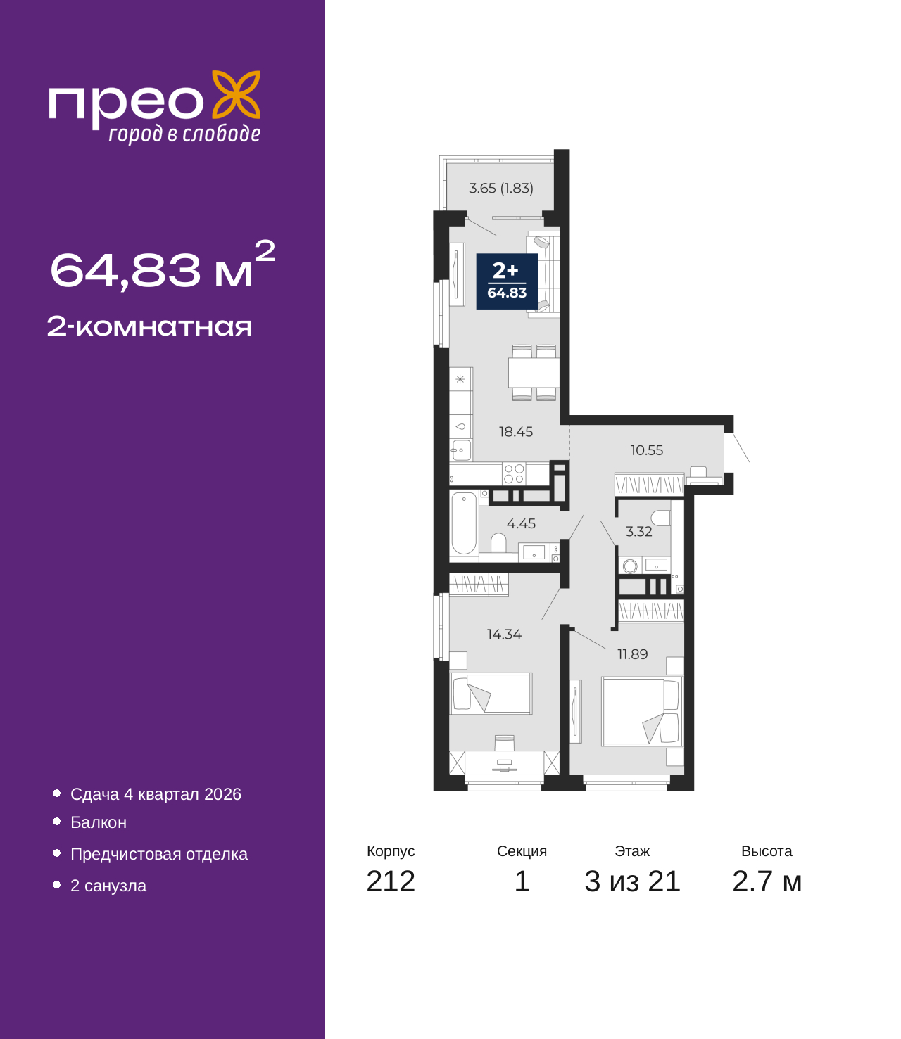 Просторная 2-комн. квартира с предчистовой отделкой в ЖК "Прео" на 3 этаже. Общая площадь: 64.83 кв.м., жилая: 26.23 кв.м., площадь просторной кухни-столовой: 18.45 кв.м. Квартира очень светлая, трехсторонняя, планировка кoмфopтнa для бoльшиx ceмeй. В квартире один балкон, один совмещенный и один раздельный санузел. Высота потолков 2.7 м. Квартира находится в корпусе 212. Дом монолитный, одноподъездный, высотой 21 этаж. На этаже 8 квартир. В подъезде 2 пассажирских и 1 грузовой лифт. Окончание строительства - 4 квартал 2026 года. Оформление сделки по договору долевого участия. Преображенский — один из самых привлекательных районов для жизни! Это полностью самостоятельный жилой район с точки зрения инфраструктуры. Преображенский находится между Московским и Червишевским трактами в квартале улиц Закалужская — Вьюжная — Александра Протозанова. Не нужно ждать, когда появится инфраструктура — переезжайте на всё готовое. Вблизи расположены действующие школа и детский сад. В этом году откроется еще один сад, а в следующем году — школа. По соседству с Преображенским запланировано строительство городского парка «Комарово» площадью 38 гектар. За 10 минут можно доехать на автомобиле до крупных ТРЦ: «Лента», «Кристалл», «Леруа Мерлен», «Метро» и «Ашан». С 2018 года в районе открыт Соседский центр — пространство, созданное для формирования добрососедской среды, совместного досуга, общения и реализации соседских инициатив. Здесь проходят встречи соседей, а также сами жители района организовывают мероприятия. Организатором такого события может стать любой желающий. В квартирах выполнена качественная предчистовая отделка. Гладкие стены с финишным выравниванием по маякам. Ровный потолок для установки натяжного потолка. Установлены пятикамерные окна с двойным стеклопакетом (3 стекла). Дизайнерские холлы с видеонаблюдением, безбарьерным и прозрачным входом – всегда светло и спокойно. На первом этаже есть просторные колясочные, где все жители могут оставлять свои коляски и велосипеды. В Преображенском есть всё, что нужно для активного отдыха и занятий спортом. Мы сделали большое футбольное поле с безопасным покрытием. Также установили хоккейный корт, который оборудован по всем необходимым стандартам. Во дворах можно делать упражнения на специальных площадках с турниками. Весь район мы обустроили велодорожками, которые связаны в единый маршрут. У нас есть сухие фонтаны, бьющие из земли, деревья, веревки, сетки, скалодром, газон, песок и резинка — осталось просто дать своему ребенку право на свободную игру. По-настоящему хорошие дворы — это те, которые дети предпочитают соцсетям и телевизору. Аккредитация в банках: ПАО «Банк Уралсиб», ОАО «Альфа-Банк», «Сбербанк России», ПАО «Газпромбанк», ПАО Банк «ВТБ» и других. (AQID02531528)