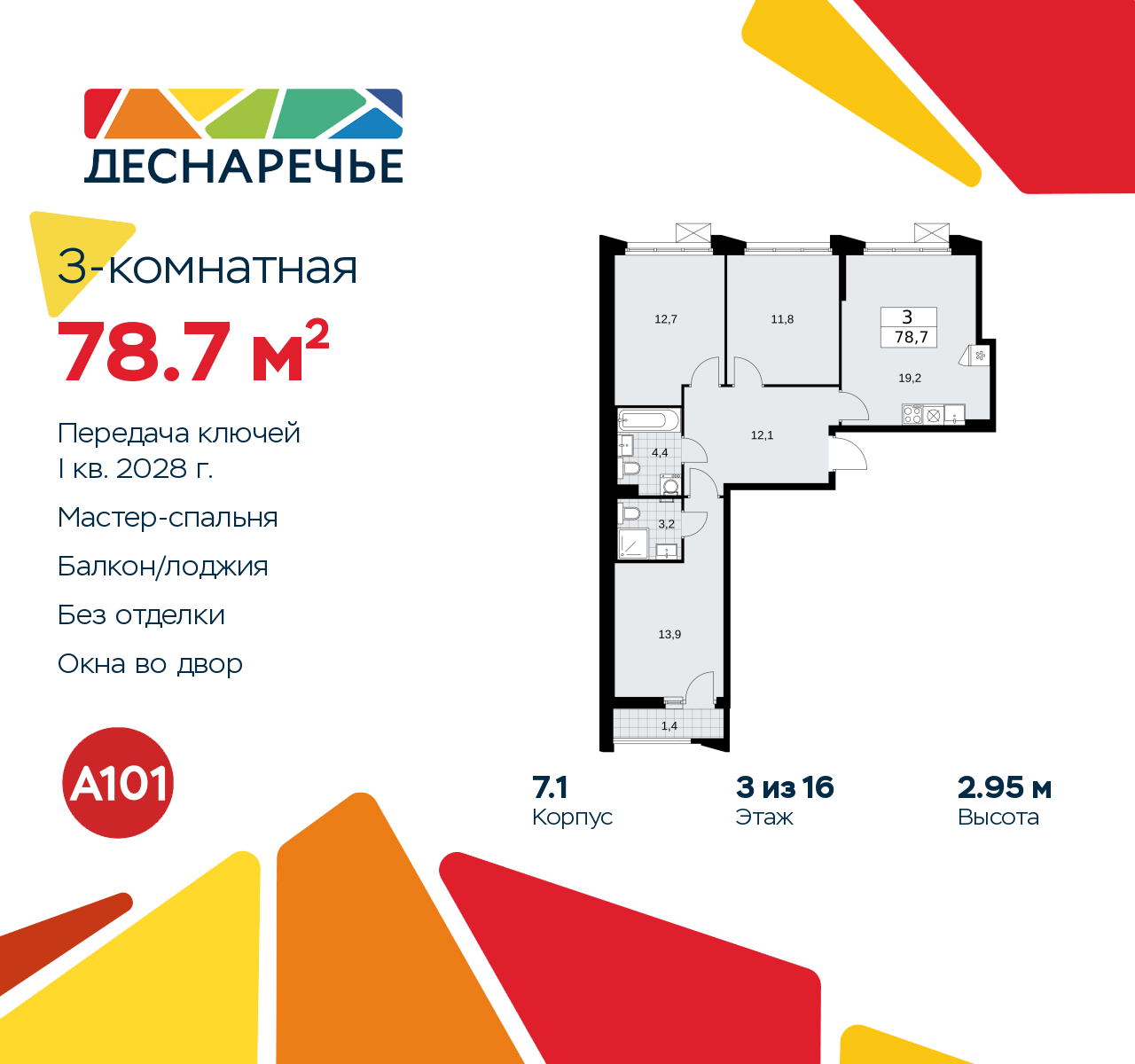 Трехкомнатная квартира от застройщика в ЖК "Деснаречье" на 3 этаже. Квартира без отделки, новый собственник может сделать ремонт по своему проекту. Общая площадь: 78.7 кв.м., жилая: 38.4 кв.м., площадь просторной кухни-столовой: 19.2 кв.м. Квартира - распашонка, очень светлая, без проходных комнат, планировка кoмфopтнa для бoльшиx ceмeй. В квартире одна лоджия, два совмещенных санузла. Высота потолков 2.95 м. Эта квартира предлагается без отделки. Будут установлены стеклопакеты с повышенной тепло- и шумоизоляцией, в квартиру заведены все коммуникации. Вы сможете в полном объеме реализовать ваши идеи обустройства вашего комфортного дома. Для тех, кто ценит время и не хочет дополнительных трат на ремонт мы предлагаем квартиры с предчистовой и дизайнерской отделкой. Дом монолитный, многоподъездный, переменной этажности, от 8 до 16 этажей. Квартира находится в 5-й секции высотой 8 этажей в корпусе 7.1. На этаже 5 квартир. В подъезде 1 грузовой лифт. Начало строительства - 2 квартал 2025 года. Окончание строительства - 1 квартал 2028 года. Оформление сделки по договору долевого участия. Артикул квартиры по базе застройщика 88К-7.1-253. Масштабный проект "Деснаречье" на юго-западе Москвы, который включает три новых района («квартала»), объединённые общей идеей – воплотить в реальность мечты современных жителей столицы об интересном, комфортном и разноплановом городском пространстве в окружении рек и лесов, словно сошедших с полотен русских живописцев: - «Берег» оценят все, кому близка водная стихия: плеск волн, солнечные блики и прогулки вдоль тихого течения речи. - «Лес» утопает в зелени парков и лесов. Здесь соблюдён идеальный баланс загородного спокойствия и столичного комфорта. - «Парк», самый энергичный и яркий, отличается высокой концентрацией пространств для спорта и творчества. Жилой комплекс "Деснаречье" расположится в 12 км от МКАД по современному Калужскому шоссе. Внешний облик зданий соответствует современному стилю и стандартам, характерным и для других популярных проектов ГК «А101»: сочетание контрастных тонов, большое количество остекления, в котором отражается небо, гармония с природным окружением. Весь город - в вашем районе. Находиться на территории «15-минутного города» значит иметь всё необходимое для полноценной жизни в шаговой доступности. Маршруты в районе «Деснаречье» выстроены так, чтобы добраться до магазинов, парков, школ, салонов услуг и других объектов можно было всего за несколько минут пешком или на велосипеде. Двор закрытый от машин – это тишина, комфорт и безопасность, поэтому все машино-места (включая «семейные» и увеличенные, с возможностью установки роллетных шкафов) находятся в подземном паркинге. В паркинги можно спуститься на лифте из любого подъезда или по лестнице. Рядом с «Деснаречьем» в 2027 году планируется открытие станции метро «Десна», до которой будет удобно добраться пешком или на велосипеде. Дорога на автомобиле до перехватывающих парковок станций «Ольховая» и «Прокшино» займёт около 10 минут. В процессе реализации проекта будут появляться новые маршруты общественного транспорта по районам. Уже сейчас на Калужском шоссе развита сеть наземного транспорта: два десятка автобусов и маршрутных такси прибывают на остановки с интервалом 5–10 минут. (AQID02490558)