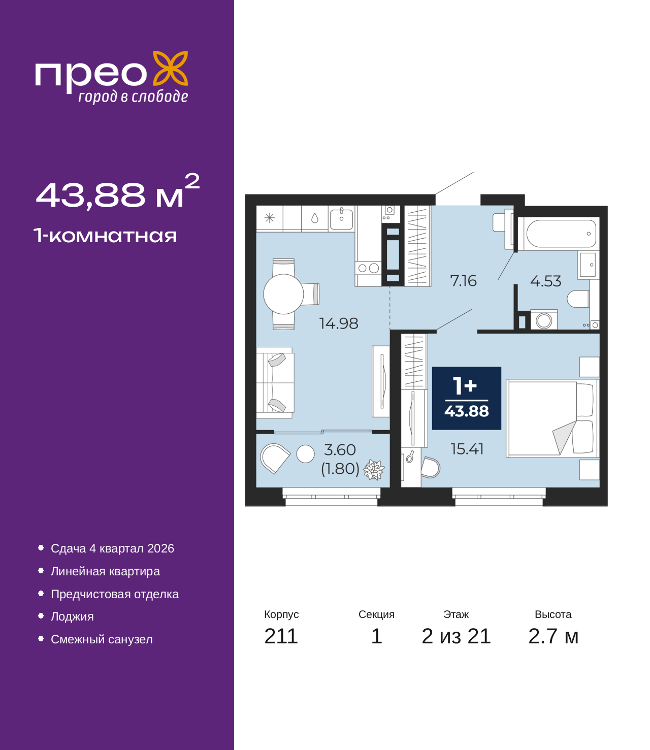 Продается 1-комн. квартира с предчистовой отделкой в ЖК "Прео" на 2 этаже. Общая площадь: 43.88 кв.м., жилая: 15.41 кв.м., площадь просторной кухни-столовой: 14.98 кв.м. Все окна выходят на одну сторону. В квартире одна лоджия, один совмещенный санузел. Высота потолков 2.7 м. Дом монолитный, черырехподъездный, переменной этажности, от 14 до 21 этажей. Квартира находится в 1-й секции высотой 21 этаж в корпусе 211. На этаже 8 квартир. В подъезде 1 пассажирский и 1 грузовой лифт. Окончание строительства - 4 квартал 2026 года. Оформление сделки по договору долевого участия. Преображенский — один из самых привлекательных районов для жизни! Это полностью самостоятельный жилой район с точки зрения инфраструктуры. Преображенский находится между Московским и Червишевским трактами в квартале улиц Закалужская — Вьюжная — Александра Протозанова. Не нужно ждать, когда появится инфраструктура — переезжайте на всё готовое. Вблизи расположены действующие школа и детский сад. В этом году откроется еще один сад, а в следующем году — школа. По соседству с Преображенским запланировано строительство городского парка «Комарово» площадью 38 гектар. За 10 минут можно доехать на автомобиле до крупных ТРЦ: «Лента», «Кристалл», «Леруа Мерлен», «Метро» и «Ашан». С 2018 года в районе открыт Соседский центр — пространство, созданное для формирования добрососедской среды, совместного досуга, общения и реализации соседских инициатив. Здесь проходят встречи соседей, а также сами жители района организовывают мероприятия. Организатором такого события может стать любой желающий. В квартирах выполнена качественная предчистовая отделка. Гладкие стены с финишным выравниванием по маякам. Ровный потолок для установки натяжного потолка. Установлены пятикамерные окна с двойным стеклопакетом (3 стекла). Дизайнерские холлы с видеонаблюдением, безбарьерным и прозрачным входом – всегда светло и спокойно. На первом этаже есть просторные колясочные, где все жители могут оставлять свои коляски и велосипеды. В Преображенском есть всё, что нужно для активного отдыха и занятий спортом. Мы сделали большое футбольное поле с безопасным покрытием. Также установили хоккейный корт, который оборудован по всем необходимым стандартам. Во дворах можно делать упражнения на специальных площадках с турниками. Весь район мы обустроили велодорожками, которые связаны в единый маршрут. У нас есть сухие фонтаны, бьющие из земли, деревья, веревки, сетки, скалодром, газон, песок и резинка — осталось просто дать своему ребенку право на свободную игру. По-настоящему хорошие дворы — это те, которые дети предпочитают соцсетям и телевизору. Аккредитация в банках: ОАО «Альфа-Банк», ПАО «Банк Уралсиб», ПАО «Газпромбанк», «Сбербанк России», ПАО Банк «ВТБ» и других. (AQID02427580)