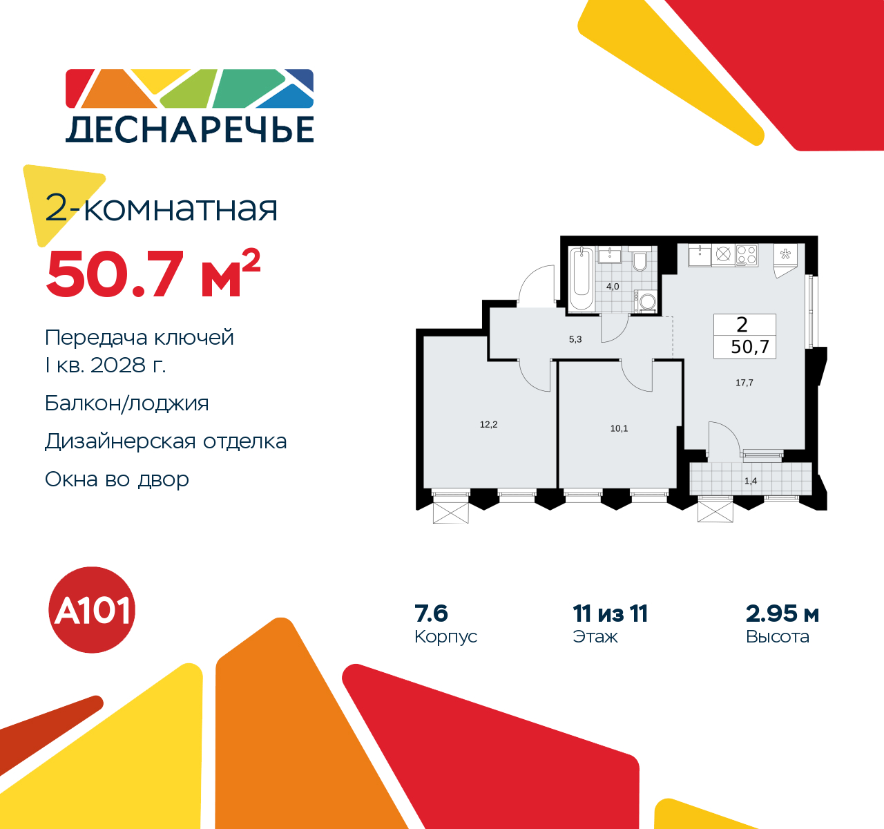 Продается двухкомнатная квартира с отделкой в ЖК "Деснаречье" на 11 этаже. Общая площадь: 50.7 кв.м., жилая: 22.3 кв.м., площадь просторной кухни-столовой: 17.7 кв.м. Угловая квартира, окна oбecпeчивaют paвнoмepнoe ocвeщeниe в тeчeниe дня. В квартире одна лоджия, один совмещенный санузел. Высота потолков 2.95 м. Эта квартира будет сдана с дизайнеркой отделкой "под ключ". Специально для вас мы разработали несколько решений дизайнерской отделки. В отделке используются только современный высококлассные материалы, на все работы предоставляется гарантия. В таком случае вы оплачиваете отделку в сегодняшних ценах, а эту стоимость вы можете разнести в ипотечных платежах. Дом монолитный, двухподъездный, высотой 11 этажей. Квартира находится во 2-й секции в корпусе 7.6. На этаже 5 квартир. В подъезде 1 пассажирский и 1 грузовой лифт. Начало строительства - 2 квартал 2025 года. Окончание строительства - 1 квартал 2028 года. Оформление сделки по договору долевого участия. Артикул квартиры по базе застройщика 88К-7.6-1313. Масштабный проект "Деснаречье" на юго-западе Москвы, который включает три новых района («квартала»), объединённые общей идеей – воплотить в реальность мечты современных жителей столицы об интересном, комфортном и разноплановом городском пространстве в окружении рек и лесов, словно сошедших с полотен русских живописцев: - «Берег» оценят все, кому близка водная стихия: плеск волн, солнечные блики и прогулки вдоль тихого течения речи. - «Лес» утопает в зелени парков и лесов. Здесь соблюдён идеальный баланс загородного спокойствия и столичного комфорта. - «Парк», самый энергичный и яркий, отличается высокой концентрацией пространств для спорта и творчества. Жилой комплекс "Деснаречье" расположится в 12 км от МКАД по современному Калужскому шоссе. Внешний облик зданий соответствует современному стилю и стандартам, характерным и для других популярных проектов ГК «А101»: сочетание контрастных тонов, большое количество остекления, в котором отражается небо, гармония с природным окружением. Весь город - в вашем районе. Находиться на территории «15-минутного города» значит иметь всё необходимое для полноценной жизни в шаговой доступности. Маршруты в районе «Деснаречье» выстроены так, чтобы добраться до магазинов, парков, школ, салонов услуг и других объектов можно было всего за несколько минут пешком или на велосипеде. Двор закрытый от машин – это тишина, комфорт и безопасность, поэтому все машино-места (включая «семейные» и увеличенные, с возможностью установки роллетных шкафов) находятся в подземном паркинге. В паркинги можно спуститься на лифте из любого подъезда или по лестнице. Рядом с «Деснаречьем» в 2027 году планируется открытие станции метро «Десна», до которой будет удобно добраться пешком или на велосипеде. Дорога на автомобиле до перехватывающих парковок станций «Ольховая» и «Прокшино» займёт около 10 минут. В процессе реализации проекта будут появляться новые маршруты общественного транспорта по районам. Уже сейчас на Калужском шоссе развита сеть наземного транспорта: два десятка автобусов и маршрутных такси прибывают на остановки с интервалом 5–10 минут. (AQID02491588)
