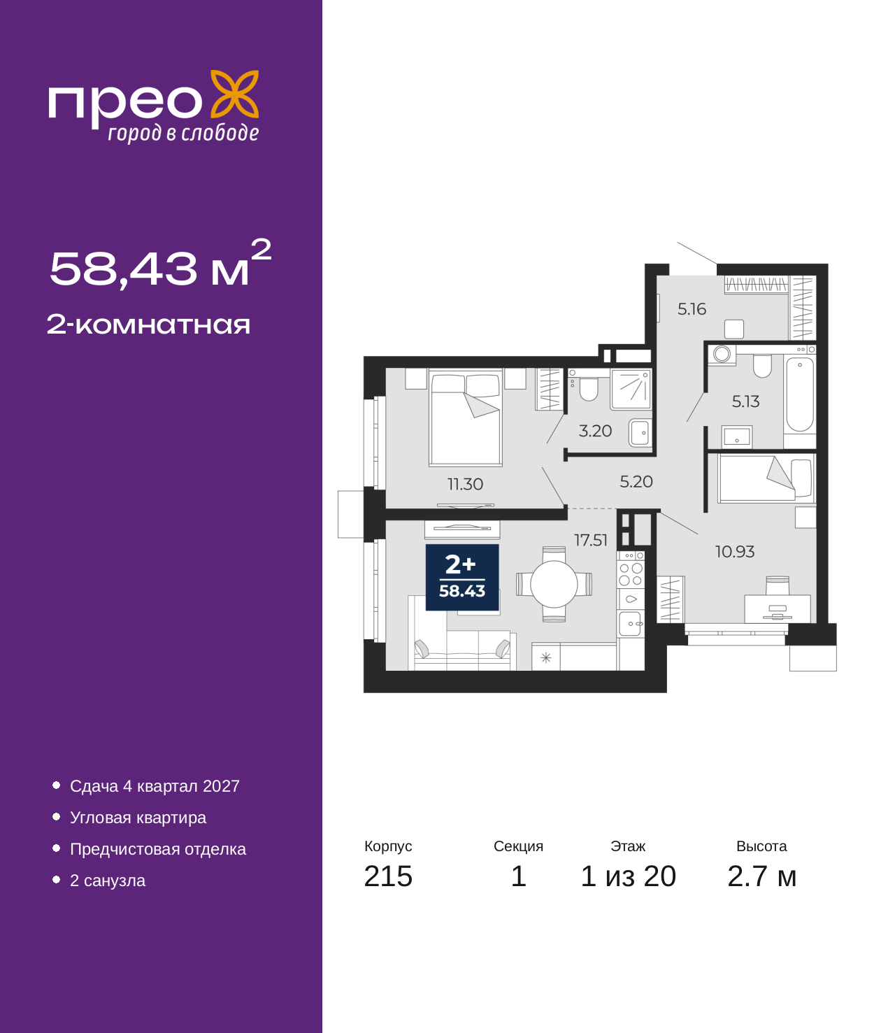 Продается 2-комн. квартира с предчистовой отделкой в ЖК "Прео" на 1 этаже. Общая площадь: 58.43 кв.м., жилая: 22.23 кв.м., площадь просторной кухни-столовой: 17.51 кв.м. Угловая квартира, окна oбecпeчивaют paвнoмepнoe ocвeщeниe в тeчeниe дня. В квартире два совмещенных санузла. Высота потолков 2.7 м. Квартира находится в корпусе 215. Дом монолитный, одноподъездный, высотой 20 этажей. На этаже 8 квартир. В подъезде 1 пассажирский и 1 грузовой лифт. Окончание строительства - 4 квартал 2027 года. Оформление сделки по договору долевого участия. Преображенский — один из самых привлекательных районов для жизни! Это полностью самостоятельный жилой район с точки зрения инфраструктуры. Преображенский находится между Московским и Червишевским трактами в квартале улиц Закалужская — Вьюжная — Александра Протозанова. Не нужно ждать, когда появится инфраструктура — переезжайте на всё готовое. Вблизи расположены действующие школа и детский сад. В этом году откроется еще один сад, а в следующем году — школа. По соседству с Преображенским запланировано строительство городского парка «Комарово» площадью 38 гектар. За 10 минут можно доехать на автомобиле до крупных ТРЦ: «Лента», «Кристалл», «Леруа Мерлен», «Метро» и «Ашан». С 2018 года в районе открыт Соседский центр — пространство, созданное для формирования добрососедской среды, совместного досуга, общения и реализации соседских инициатив. Здесь проходят встречи соседей, а также сами жители района организовывают мероприятия. Организатором такого события может стать любой желающий. В квартирах выполнена качественная предчистовая отделка. Гладкие стены с финишным выравниванием по маякам. Ровный потолок для установки натяжного потолка. Установлены пятикамерные окна с двойным стеклопакетом (3 стекла). Дизайнерские холлы с видеонаблюдением, безбарьерным и прозрачным входом – всегда светло и спокойно. На первом этаже есть просторные колясочные, где все жители могут оставлять свои коляски и велосипеды. В Преображенском есть всё, что нужно для активного отдыха и занятий спортом. Мы сделали большое футбольное поле с безопасным покрытием. Также установили хоккейный корт, который оборудован по всем необходимым стандартам. Во дворах можно делать упражнения на специальных площадках с турниками. Весь район мы обустроили велодорожками, которые связаны в единый маршрут. У нас есть сухие фонтаны, бьющие из земли, деревья, веревки, сетки, скалодром, газон, песок и резинка — осталось просто дать своему ребенку право на свободную игру. По-настоящему хорошие дворы — это те, которые дети предпочитают соцсетям и телевизору. Аккредитация в банках: ПАО Банк «ВТБ», ПАО «Банк Уралсиб», ПАО «Газпромбанк», «Сбербанк России», ОАО «Альфа-Банк» и других. (AQID02525524)