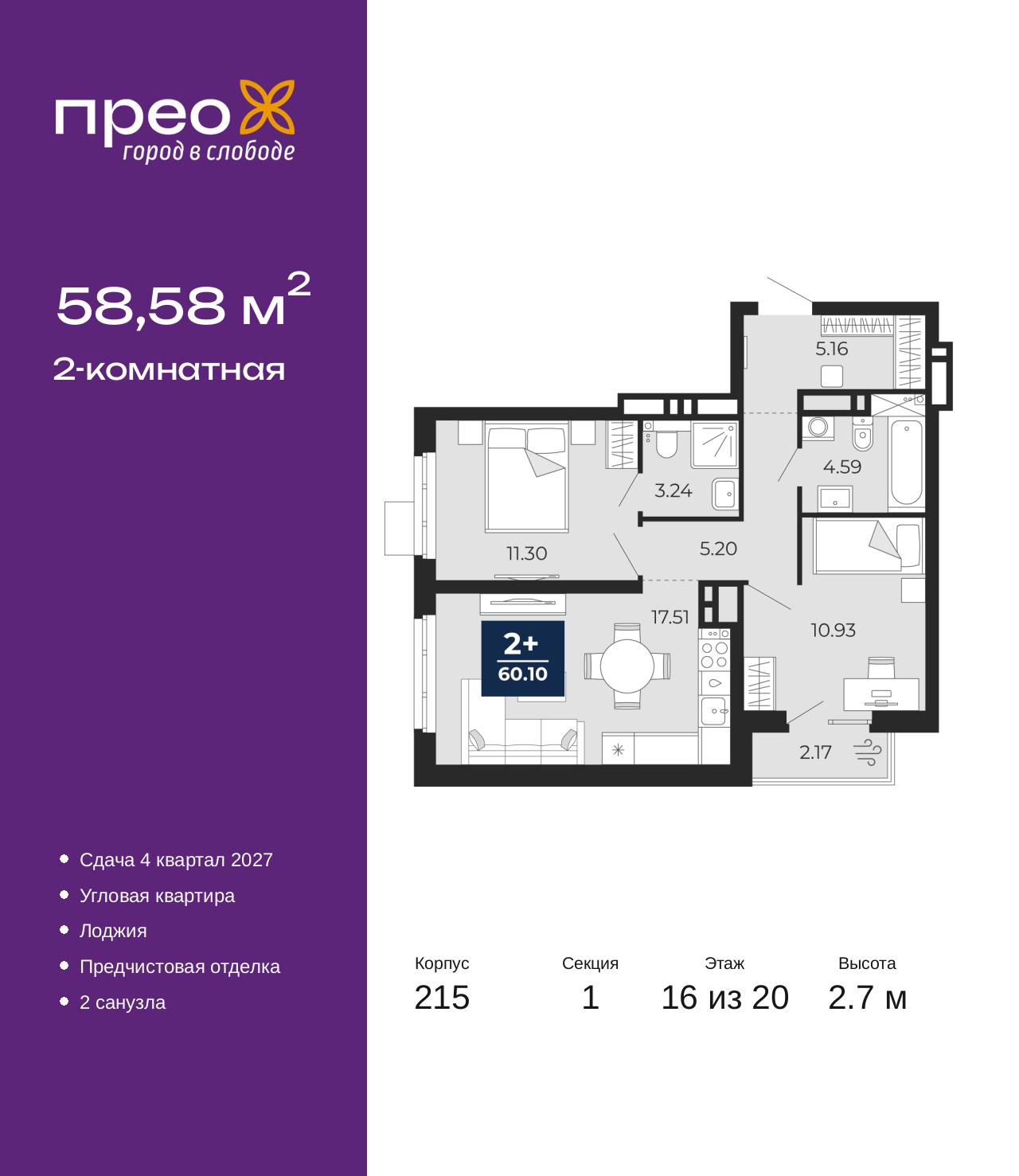 Двухкомнатная квартира с предчистовой отделкой в ЖК "Прео" на 16 этаже. Общая площадь: 58.58 кв.м., жилая: 22.23 кв.м., площадь просторной кухни-столовой: 17.51 кв.м. Угловая квартира, идеально подойдет любителям тишины и панорамных видов. В квартире одна лоджия, два совмещенных санузла. Высота потолков 2.7 м. Квартира находится в корпусе 215. Дом монолитный, одноподъездный, высотой 20 этажей. На этаже 8 квартир. В подъезде 1 пассажирский и 1 грузовой лифт. Окончание строительства - 4 квартал 2027 года. Оформление сделки по договору долевого участия. Преображенский — один из самых привлекательных районов для жизни! Это полностью самостоятельный жилой район с точки зрения инфраструктуры. Преображенский находится между Московским и Червишевским трактами в квартале улиц Закалужская — Вьюжная — Александра Протозанова. Не нужно ждать, когда появится инфраструктура — переезжайте на всё готовое. Вблизи расположены действующие школа и детский сад. В этом году откроется еще один сад, а в следующем году — школа. По соседству с Преображенским запланировано строительство городского парка «Комарово» площадью 38 гектар. За 10 минут можно доехать на автомобиле до крупных ТРЦ: «Лента», «Кристалл», «Леруа Мерлен», «Метро» и «Ашан». С 2018 года в районе открыт Соседский центр — пространство, созданное для формирования добрососедской среды, совместного досуга, общения и реализации соседских инициатив. Здесь проходят встречи соседей, а также сами жители района организовывают мероприятия. Организатором такого события может стать любой желающий. В квартирах выполнена качественная предчистовая отделка. Гладкие стены с финишным выравниванием по маякам. Ровный потолок для установки натяжного потолка. Установлены пятикамерные окна с двойным стеклопакетом (3 стекла). Дизайнерские холлы с видеонаблюдением, безбарьерным и прозрачным входом – всегда светло и спокойно. На первом этаже есть просторные колясочные, где все жители могут оставлять свои коляски и велосипеды. В Преображенском есть всё, что нужно для активного отдыха и занятий спортом. Мы сделали большое футбольное поле с безопасным покрытием. Также установили хоккейный корт, который оборудован по всем необходимым стандартам. Во дворах можно делать упражнения на специальных площадках с турниками. Весь район мы обустроили велодорожками, которые связаны в единый маршрут. У нас есть сухие фонтаны, бьющие из земли, деревья, веревки, сетки, скалодром, газон, песок и резинка — осталось просто дать своему ребенку право на свободную игру. По-настоящему хорошие дворы — это те, которые дети предпочитают соцсетям и телевизору. Аккредитация в банках: ОАО «Альфа-Банк», ПАО «Банк Уралсиб», ПАО «Газпромбанк», «Сбербанк России», ПАО Банк «ВТБ» и других. (AQID02525559)