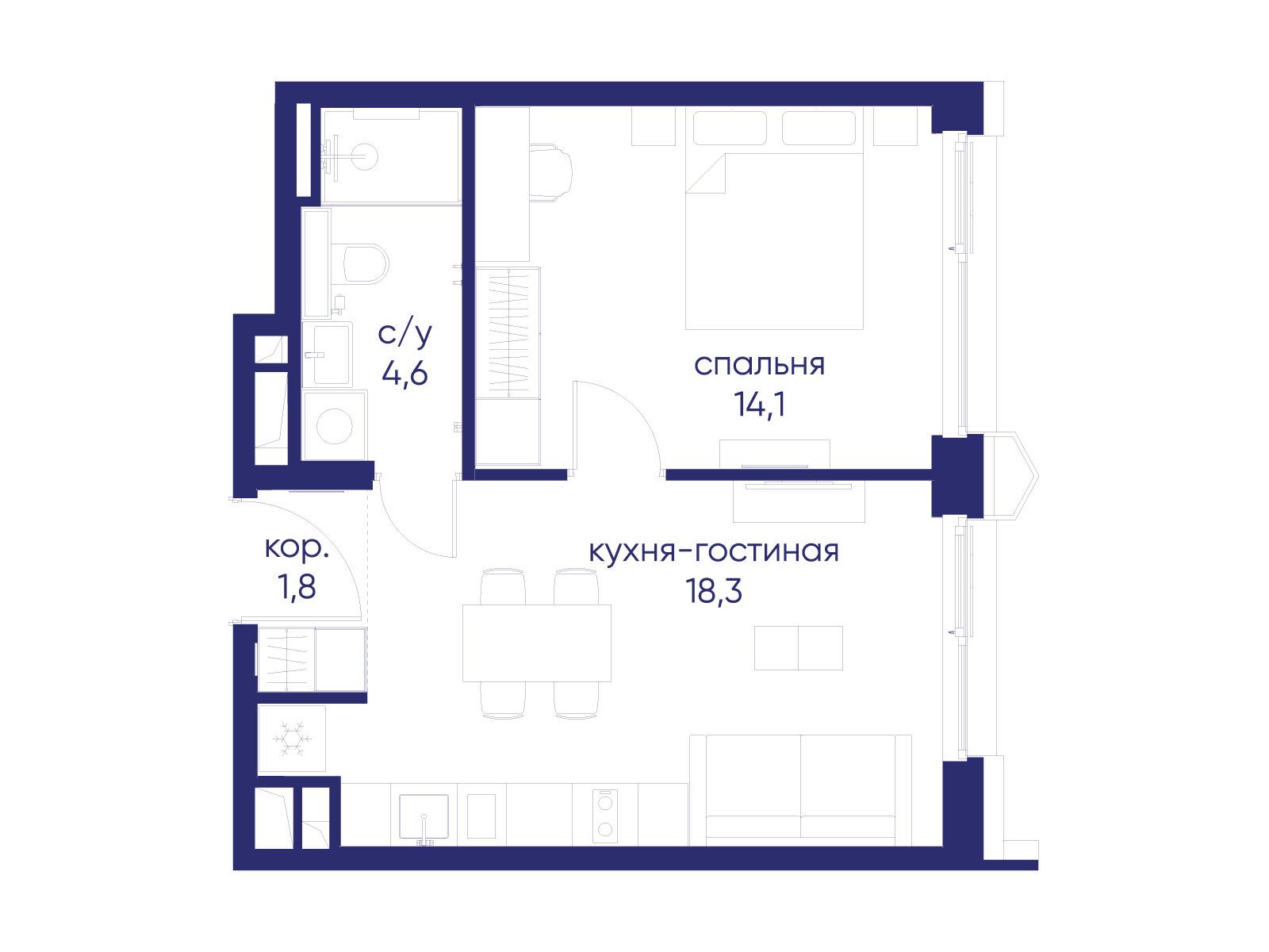 - Жилая площадь 14.1 м²