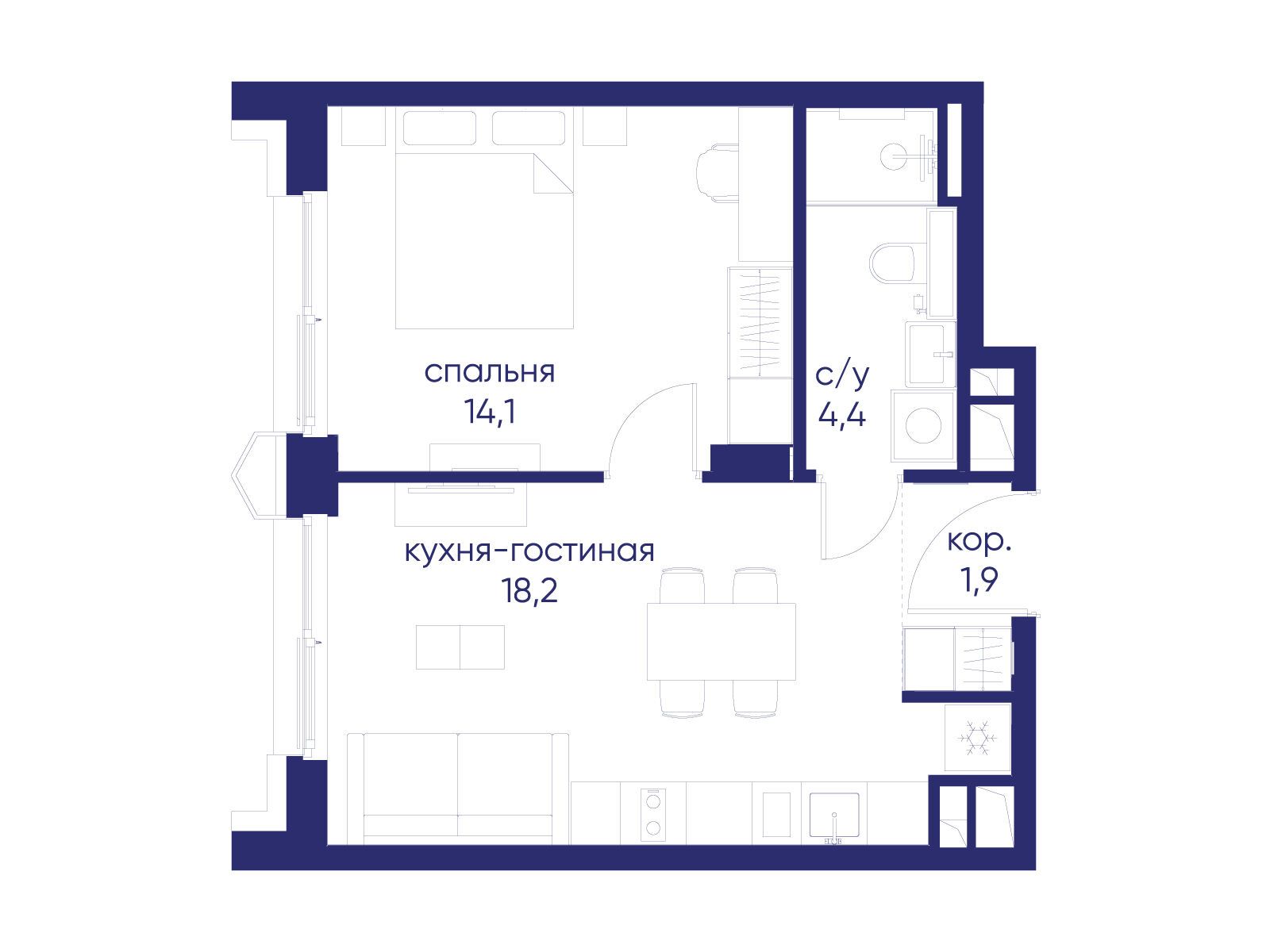 - Жилая площадь 14.1 м²