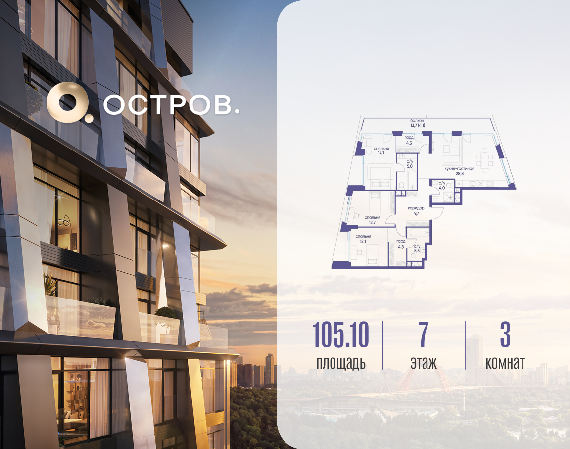 Продаётся трехкомнатная квартира от застройщика: общая площадь 105.12 м², жилая 38.90 м², кухня 28.80 м², 7, жилой квартал «Остров 12», корпус 1 (12.1 квартал) (секция 2). срок сдачи: 4-кв. 2025. , 3 санузла: 3 совмещенных. В жилой зоне 2 больших окна на одну сторону, хорошая инсоляция. Позвоните сейчас и забронируйте квартиру! Купите квартиру для курортной жизни в Москве в квартале ОСТРОВ.12.1. Это единственный на ОСТРОВЕ квартал бизнес-класса, расположенный на первой линии у реки - здесь царит атмосфера ежедневного отпуска. Дома созданы в узнаваемом футуристичном стиле и выглядят как произведения современного искусства. Для жителей предусмотрены фитнес-рум и детский клуб, гостиная и кинотеатр, переговорные и репетиторские комнаты. На крышах устроены видовые общественные пространства с зонами для йоги, коворкингами, лаунжами. Двор-парк располагает всем необходимым для отдыха и общения всех возрастов. ОСТРОВ.12.1 - часть жилого комплекса на западе Москвы, в 15 минутах езды от центра. Это настоящий заповедник посреди большого города, в окружении реки и 650 га заповедников. Здесь все необходимое находится по соседству: от детского сада до супермаркета, от фитнес-зала до серфинг-центра. На территории созданы все условия для отдыха и общения: клубная инфраструктура в домах и дворы-парки, набережные и променады, маршруты для спортсменов, детей и возрастных жителей. В нескольких минутах ходьбы расположена станция метро "Мнёвники" БКЛ. На автомобиле - 10 минут до Москва-Сити и 15 минут до Садового кольца.