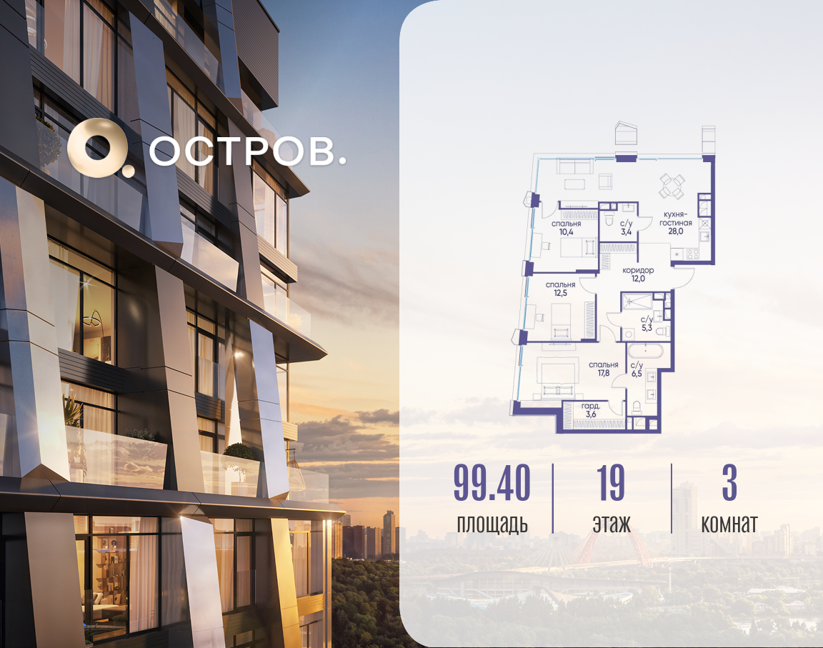 Продаётся трехкомнатная квартира от застройщика: общая площадь 99.42 м², жилая 40.70 м², кухня 28.00 м², 19, жилой квартал «Остров 12», корпус 3 (12.1 квартал) (секция 1). срок сдачи: 4-кв. 2025. , 3 санузла: 1 раздельный и 2 совмещенных. В жилой зоне 2 больших окна на одну сторону, хорошая инсоляция. Позвоните сейчас и забронируйте квартиру! Купите квартиру для курортной жизни в Москве в квартале ОСТРОВ.12.1. Это единственный на ОСТРОВЕ квартал бизнес-класса, расположенный на первой линии у реки - здесь царит атмосфера ежедневного отпуска. Дома созданы в узнаваемом футуристичном стиле и выглядят как произведения современного искусства. Для жителей предусмотрены фитнес-рум и детский клуб, гостиная и кинотеатр, переговорные и репетиторские комнаты. На крышах устроены видовые общественные пространства с зонами для йоги, коворкингами, лаунжами. Двор-парк располагает всем необходимым для отдыха и общения всех возрастов. ОСТРОВ.12.1 - часть жилого комплекса на западе Москвы, в 15 минутах езды от центра. Это настоящий заповедник посреди большого города, в окружении реки и 650 га заповедников. Здесь все необходимое находится по соседству: от детского сада до супермаркета, от фитнес-зала до серфинг-центра. На территории созданы все условия для отдыха и общения: клубная инфраструктура в домах и дворы-парки, набережные и променады, маршруты для спортсменов, детей и возрастных жителей. В нескольких минутах ходьбы расположена станция метро "Мнёвники" БКЛ. На автомобиле - 10 минут до Москва-Сити и 15 минут до Садового кольца.