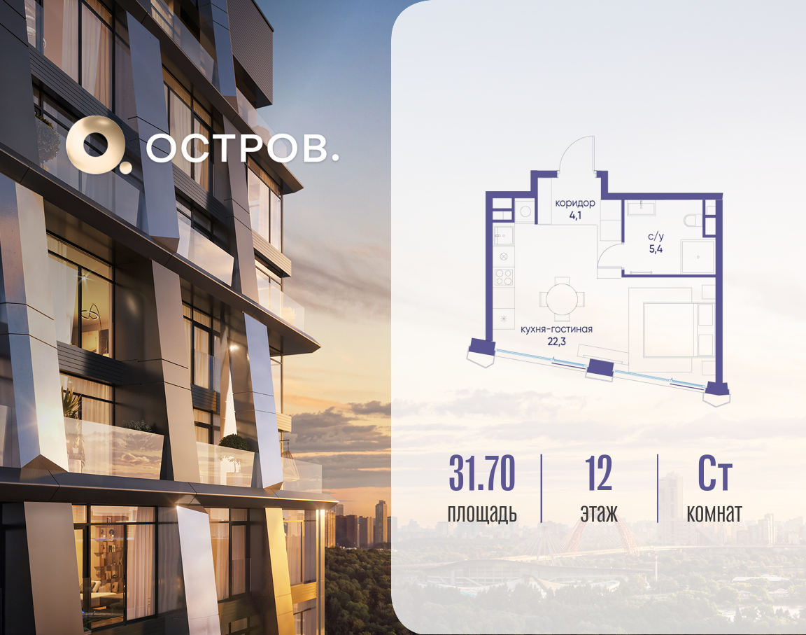 Продаётся квартира от застройщика: общая площадь 31.72 м², жилая 17.30 м², кухня 5.00 м², 12-й этаж, жилой квартал «Остров 12», корпус 2 (секция 1). Срок сдачи: 1 квартал 2029 года. 1 совмещенный санузел. В жилой зоне 2 больших окна на одну сторону, хорошая инсоляция. Позвоните сейчас и забронируйте квартиру! ОСТРОВ от Донстрой — жилой комплекс на западе Москвы, в Мневниковской пойме. Уникальное преимущество комплекса — в том, что он обособлен от города рекой и природным парком (650 га). Благодаря природному окружению эта территория имеет лучший экологический рейтинг в столице. Кварталы ОСТРОВА объединены ландшафтным дизайном в единое пространство — с набережными и Центральным бульваром. На ОСТРОВЕ любые объекты, необходимые для полноценной жизни и отдыха, находятся на расстоянии 15-минутной прогулки. Торговый центр и супермаркеты, кафе и рестораны, фитнес, салоны красоты, школы и детские сады. А также крупнейший в Москве спортивный кластер.