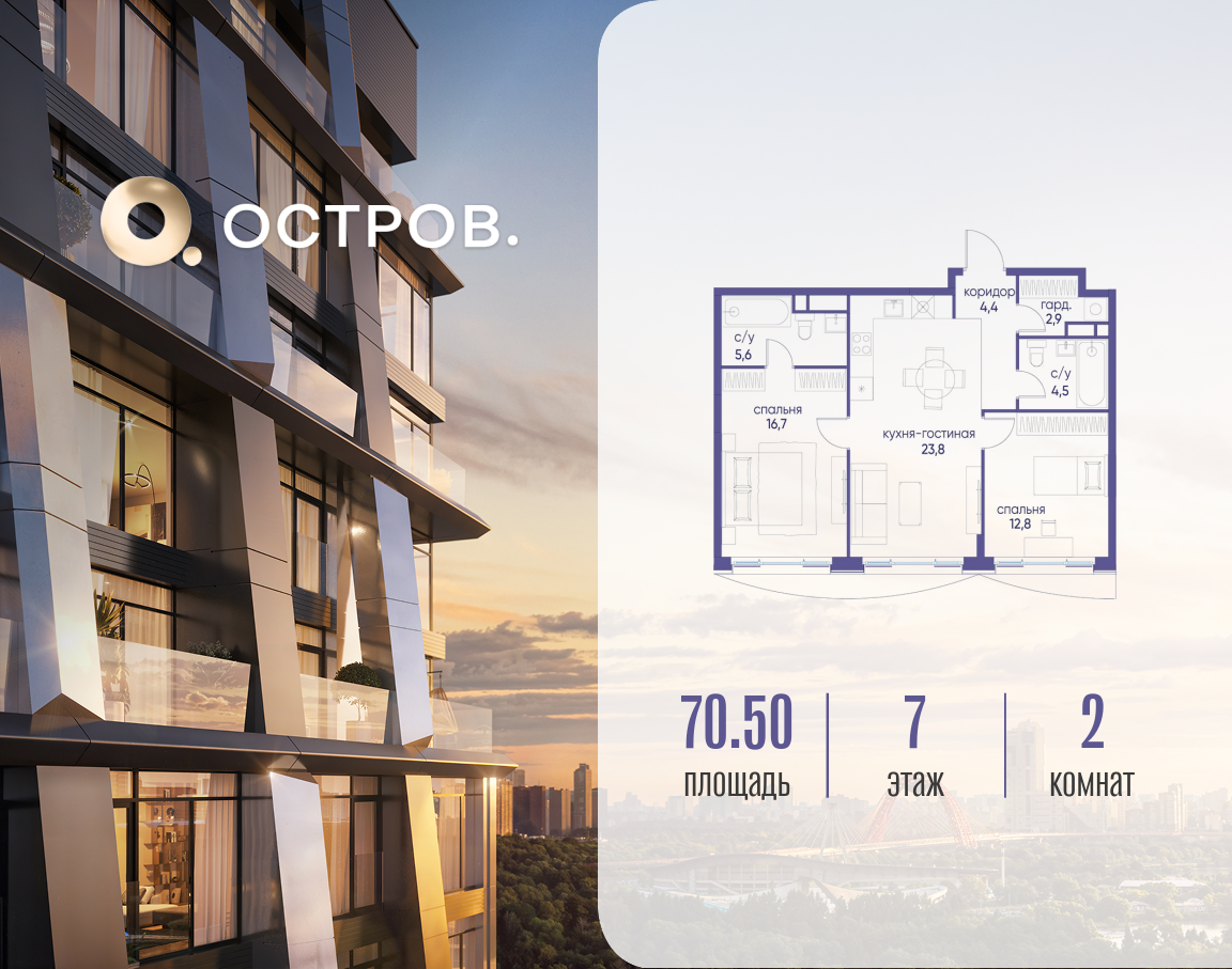 Продаётся 2-комн. квартира от застройщика: общая площадь 70.52 м², жилая 29.50 м², кухня 23.80 м², 7-й этаж, жилой квартал «Остров 12», корпус 4 (секция 1). Срок сдачи: 1 квартал 2029 года. 2 совмещенных санузла. В жилой зоне 2 больших окна на одну сторону, хорошая инсоляция. Позвоните сейчас и забронируйте квартиру! ОСТРОВ от Донстрой — жилой комплекс на западе Москвы, в Мневниковской пойме. Уникальное преимущество комплекса — в том, что он обособлен от города рекой и природным парком (650 га). Благодаря природному окружению эта территория имеет лучший экологический рейтинг в столице. Кварталы ОСТРОВА объединены ландшафтным дизайном в единое пространство — с набережными и Центральным бульваром. На ОСТРОВЕ любые объекты, необходимые для полноценной жизни и отдыха, находятся на расстоянии 15-минутной прогулки. Торговый центр и супермаркеты, кафе и рестораны, фитнес, салоны красоты, школы и детские сады. А также крупнейший в Москве спортивный кластер.