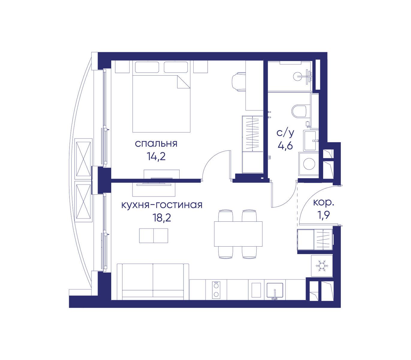 - Жилая площадь 14.2 м²